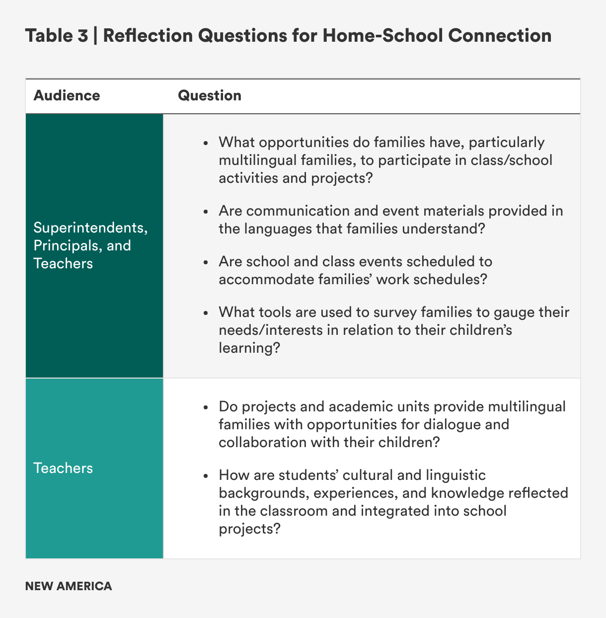 Based on the collective lessons from the districts, we argue that enacting the transformational change needed to effectively support ELs requires: (1) strong district and school leadership, (2) consistent professional learning to prepare educators to implement rigorous and research-based instructional strategies across the curriculum, and (3) genuine home-school collaboration that enriches students’ educational experiences. The brief includes questions at the end of each section to help educators consider how to transform their approach to educating linguistically diverse students.