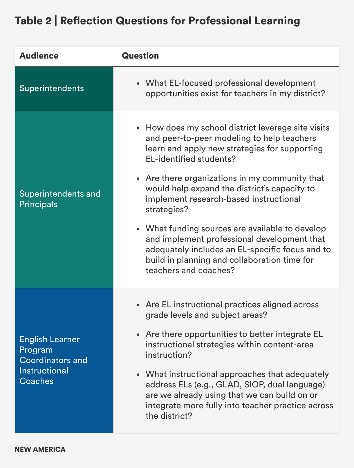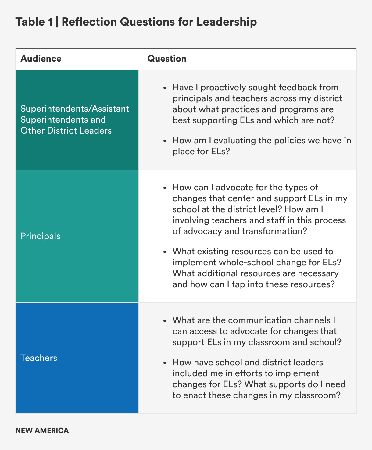 School and district leaders interested in improving their approach to EL education can begin the process by examining current gaps in the system through conversations with teachers, principals, families, and other community partners. Together, they can identify bright spots, areas of opportunity, and needed resources, and then develop a plan to begin the transformation process.