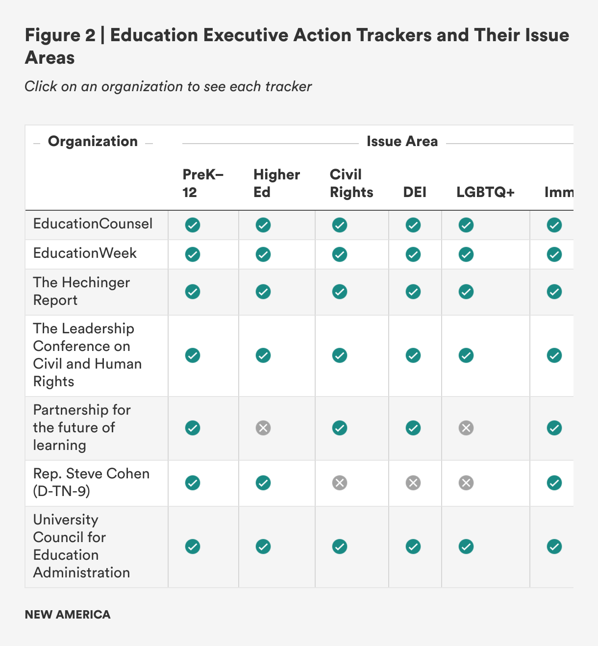 The University Council for Education Administration (UCEA) is a consortium of university-based PreK–12 leadership preparation programs across the country that focus on improving education. The UCEA Education Executive Action Tracker provides overviews and analysis of executive actions that apply to issue areas like PreK-12 school funding, immigration, civil rights, DEI, LGBTQ+, state governance, and many others. The nature of UCEA’s work means that this tracker also covers a number of higher education issue areas as well.