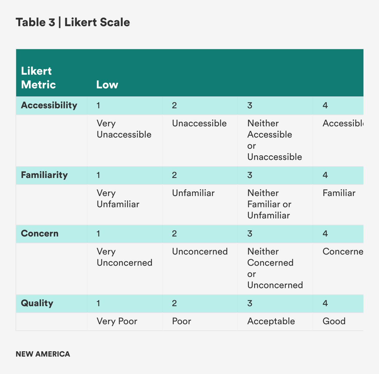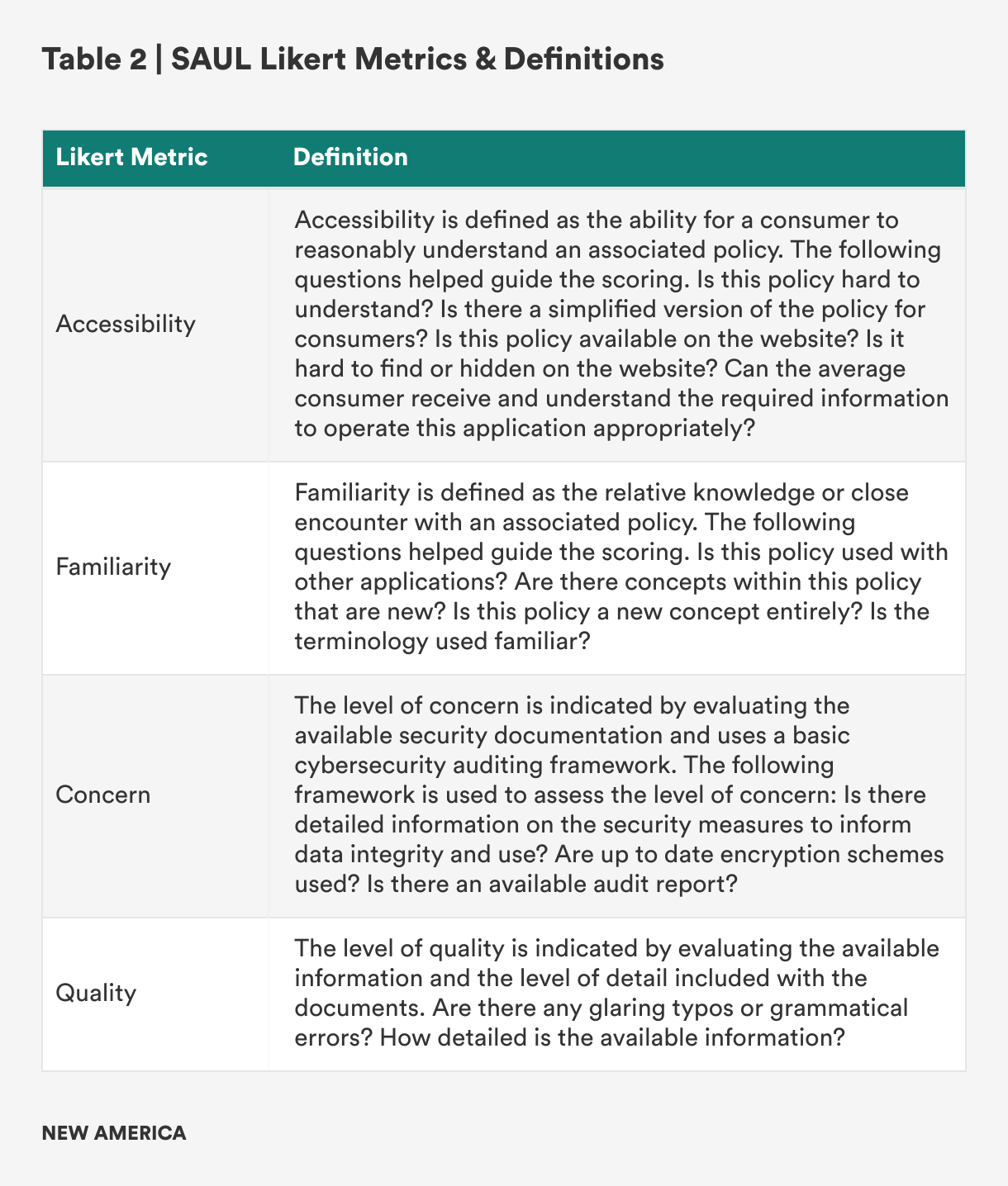 Three generative AI applications were chosen for the SAUL prototype pilot, including one generative pre-trained transformer (GPT) and two generative adversarial networks (GANs). The three applications included: Claude, MidJourney, and Sora. These tools were chosen for the pilot design of the label due to their popularity. In developing the wireframe of the label, available documentation such as privacy policies, terms of use/service, developer documentation, community guidelines, and any other addendum documents were reviewed. Each document collected was scored along four general criteria of “accessibility,” “familiarity,” “level of concern,” and “quality.” These four criteria were used to inform the widgets of the wireframe. If a particular policy scored high (e.g., a mean score of 3.5 and above), the associated indicator would be highlighted on the label. For policies that scored lower (e.g., a mean score of 3.4 and below), the associated indicator would not be highlighted on the label. The following definitions and Likert scale for each of the criteria are included in Tables 2 and 3 below.