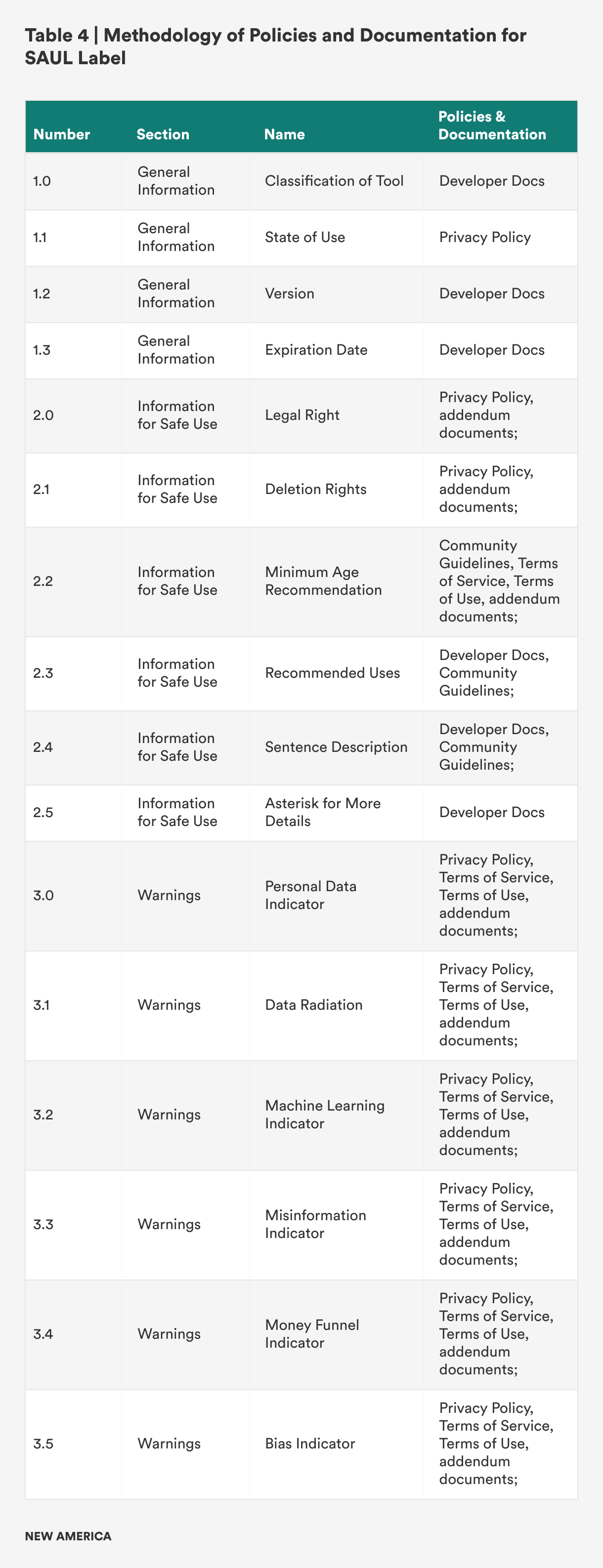 The methodology for developing the three sections of the SAUL label are included in Table 4, which shows the mapping for each section to the associated icon tool and documentation.
