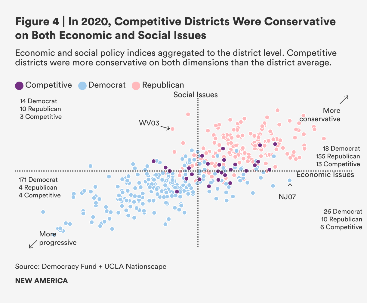 As for competitive districts, very few competitive districts in 2020 were found on the progressive quadrants of social and economic issues. Instead, of the 27 competitive districts in 2020, 70 percent were more conservative than the national average on economic issues and 59 percent were more conservative than the national average on social issues.