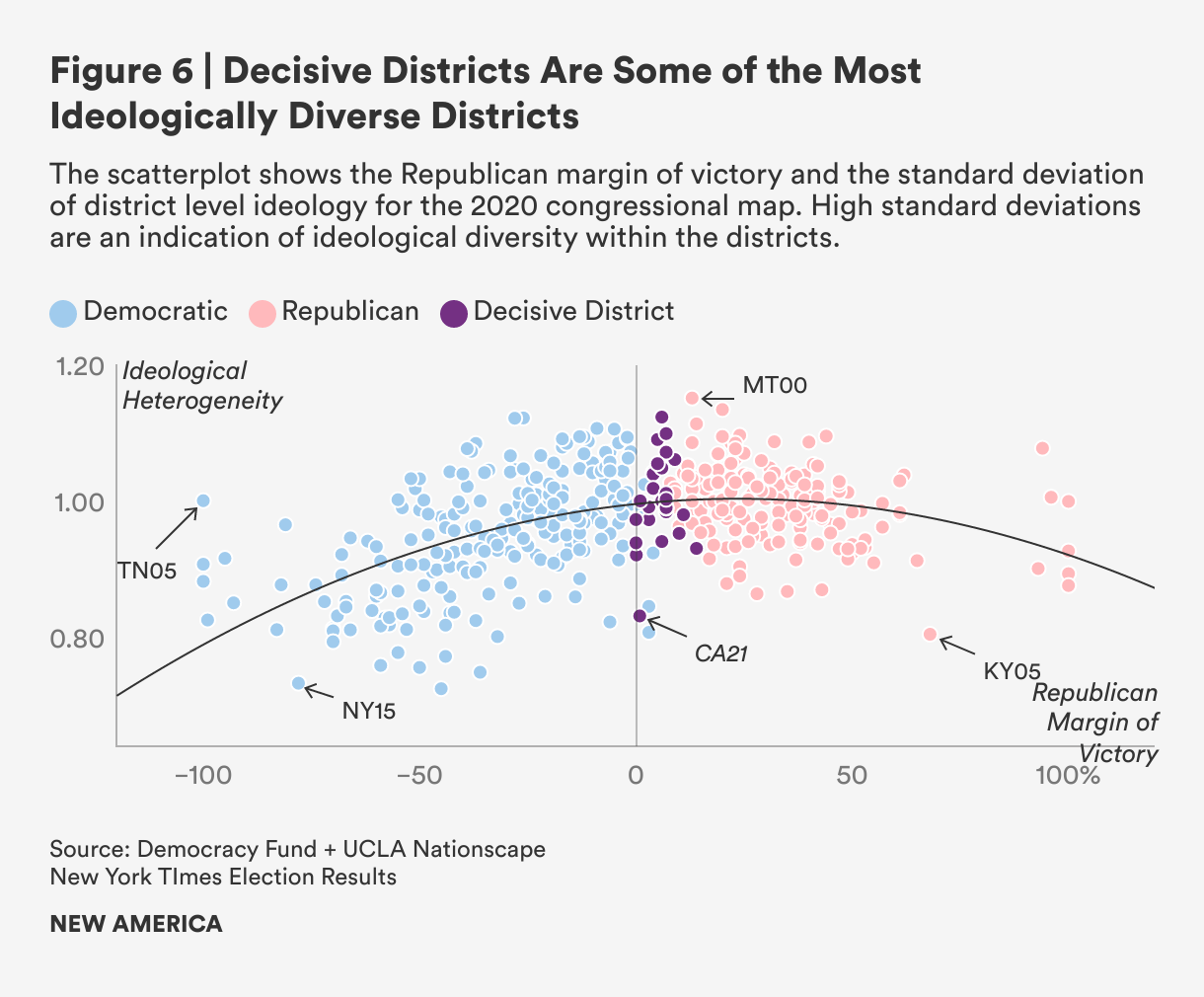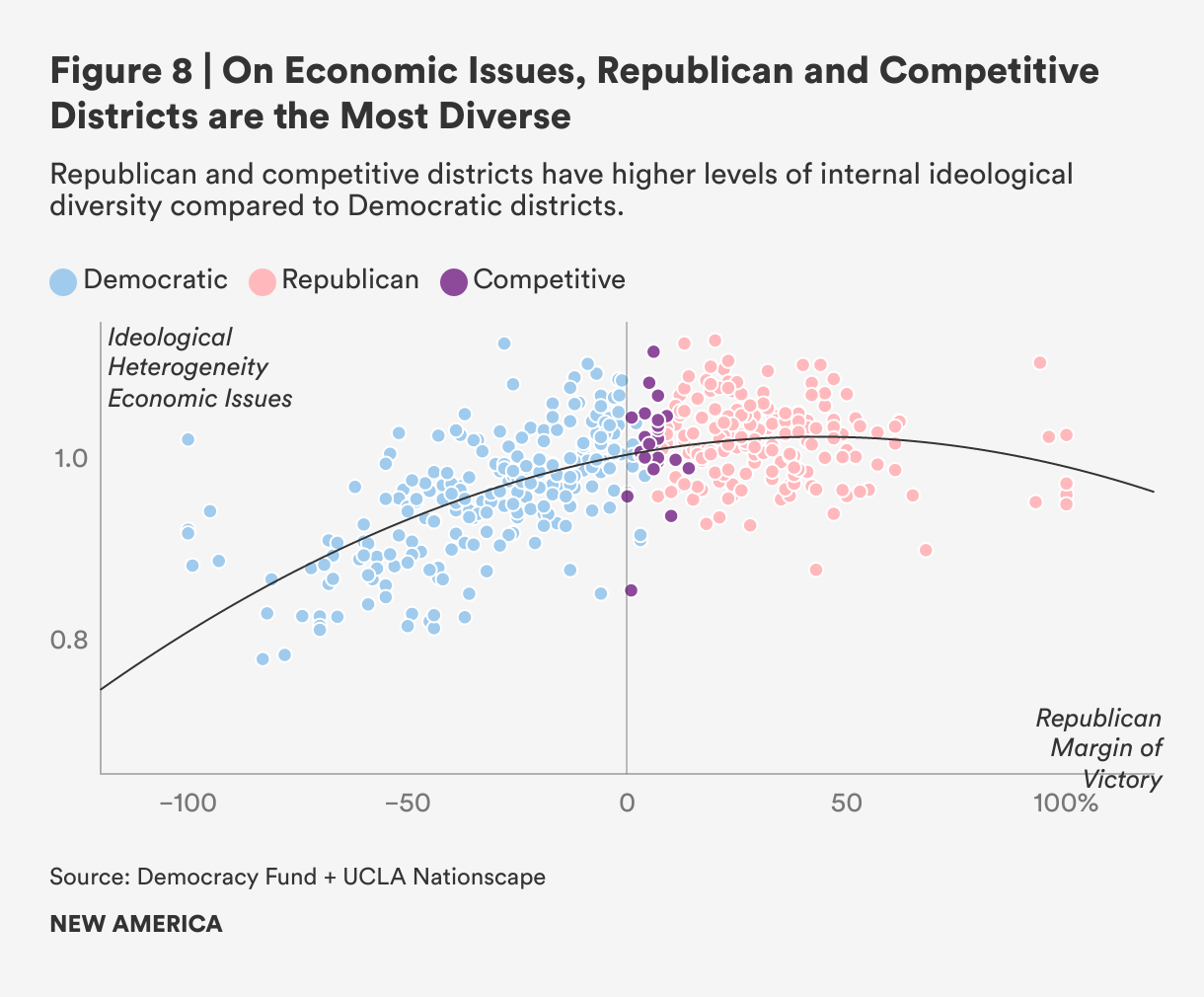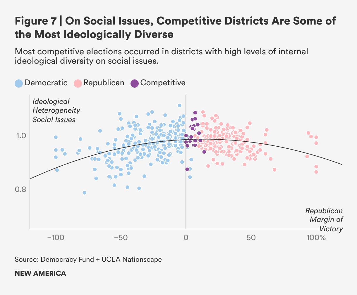 In competitive districts, we observe some of the highest levels of heterogeneity in the policy views of citizens, which reflects the mix of partisans that coexist within competitive districts. This mix likely stems from the predominantly suburban location of competitive districts, which given the political geography of the country makes it more likely that they have a more balanced share of partisans than the Republican countryside or the Democratic metropolis.