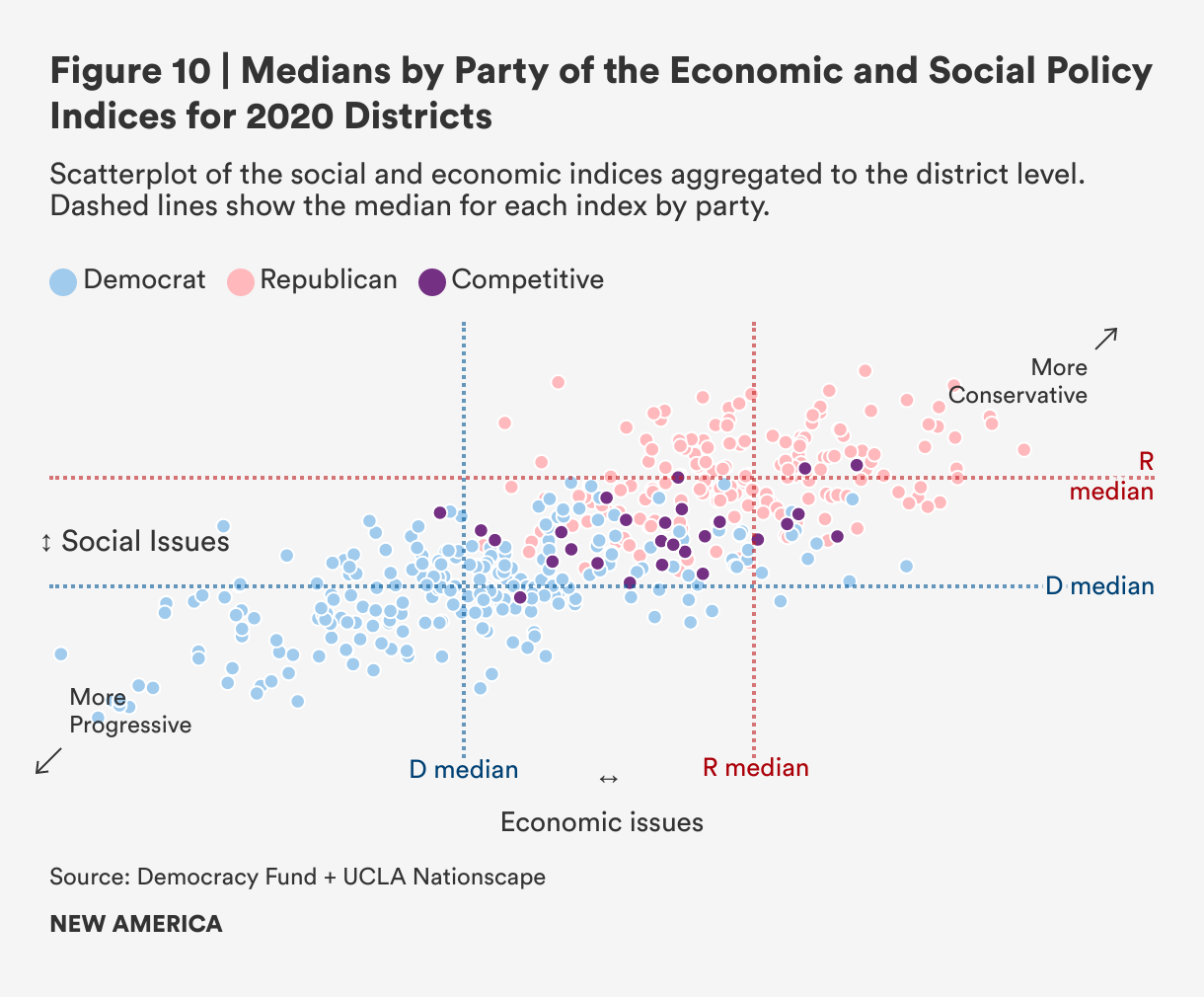 Democratic and Republican districts do differ on average on various demographic variables and they tend to gravitate towards opposite ends of the policy spectrum. But it is the winner-take-all, two-party system that exaggerates these differences and turns them into a binary, preventing the discovery of common ground and the emergence of new parties that could better represent voters in districts that are far from the median ideological points of each party. As we see in Figure 10, which shows the median values for each party on the social and economic indices, each party will be able to maximize its seats by choosing policies closest to where the majority of districts fall, but that leaves many districts inadequately represented.