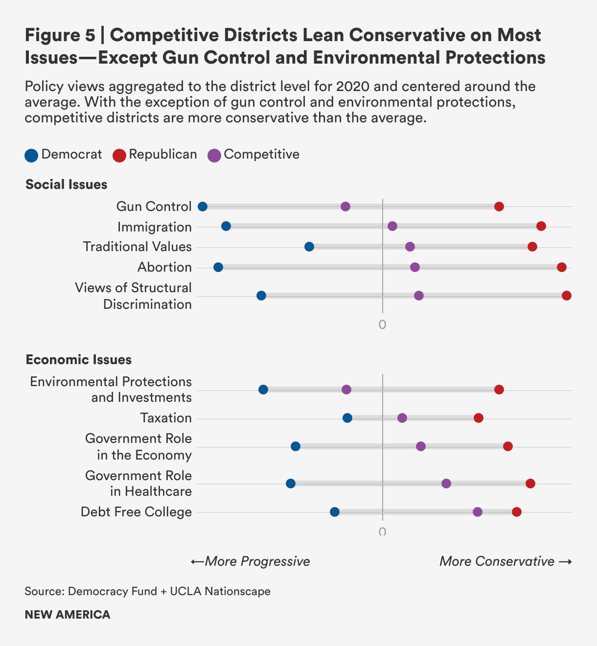 On the economic dimension, competitive districts are most progressive on issues of environmental protections and investments in technology to protect the environment. In contrast, they are most conservative on the issue of debt free college, which may help explain why that issue has become so polarizing in recent years. Following the issue of debt free college, competitive districts are most conservative on their views of the government’s role in healthcare.