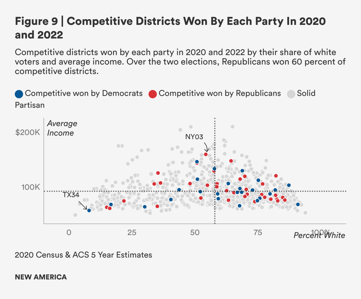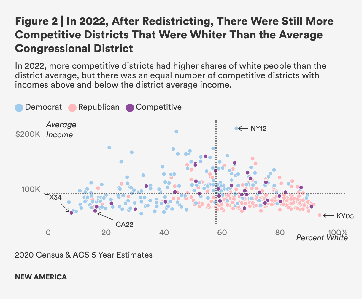 Following the redistricting process, which was done with new census data from 2020, little changed in terms of the income and ethnic composition of districts. For the 2022 midterms, we observe a similar distribution of Republican and Democratic districts across household income levels and shares of white residents. Again, most competitive districts had shares of white voters higher than the national district average. And like in 2020, there were equal numbers of competitive districts below and above the average income across the districts.