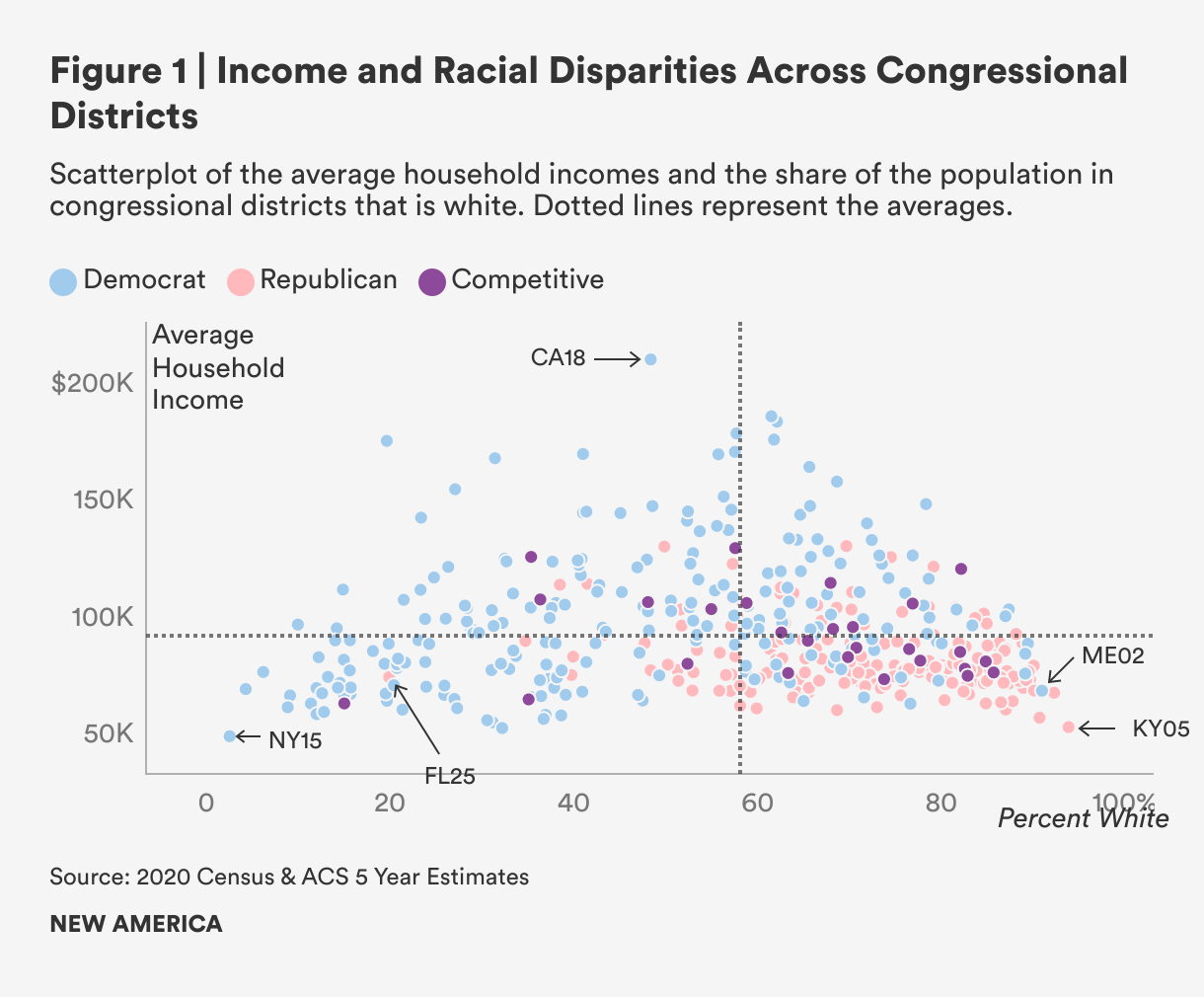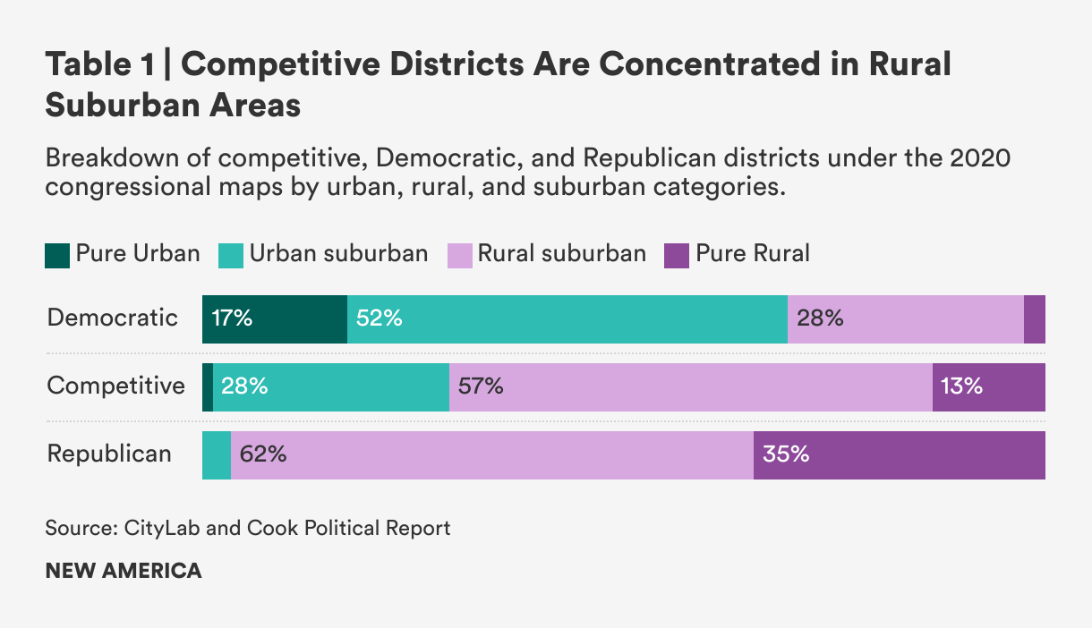 In this report, we show how Democratic and Republican districts differ from each other and where they overlap with competitive districts. Democratic districts tend to be more affluent and more diverse than Republican districts, which are mostly poorer and predominantly white. Competitive districts comprise roughly equal shares of districts that are more and less affluent than the district average, but they tend to be whiter than the average district. The winner-take-all electoral system accentuates these differences and reduces the diverse constellation of districts to a binary. This results in an inadequate representation of voters in districts that are far from the median Democratic or Republican district.