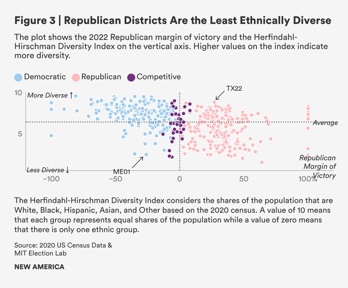 The Herfindahl-Hirschman Index shows that most Republican districts are among the least ethnically diverse while Democratic districts are the most ethnically diverse. In 2022, of all the Republican districts, 61 percent of them were below the national average of the diversity index, with high shares of white residents resulting in low levels of diversity. In contrast, 83 percent of Democratic districts were above the national average of the diversity index in 2022, which underscores the diverse coalition across ethnic groups that the Democratic party has to keep together. Competitive districts were in the middle: Of the 36 competitive districts in 2022, 19 were below the national average of the diversity index while 17 were above the average.