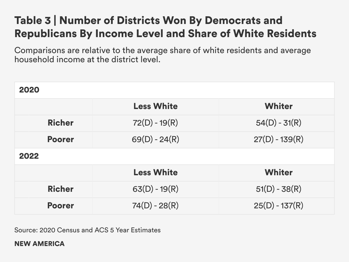 Figure 1 shows the distribution of districts based on the shares of their white population and their average household income. Districts in the upper quadrants are, on average, richer than average and those in the right-side quadrants have shares of white residents higher than the district average. As seen in the figure, most Republican districts clustered in the lower right quadrant in 2020: 71 percent of Republican districts were whiter than the national average and had lower than average household incomes. For the most part, the Republican districts that had shares of white residents below the average were districts with high shares of Hispanic residents, like those in states like California, Florida, and Texas. Democratic districts were scattered all over the other quadrants, with 57 percent of Democratic districts in high income groups. Of these higher income districts, 58 percent were below the national average of white residents and 42 percent above. Meanwhile, 31 percent of the all Democratic districts were both poorer and less white than the national average and only 12 percent were poorer but whiter than the national average.
