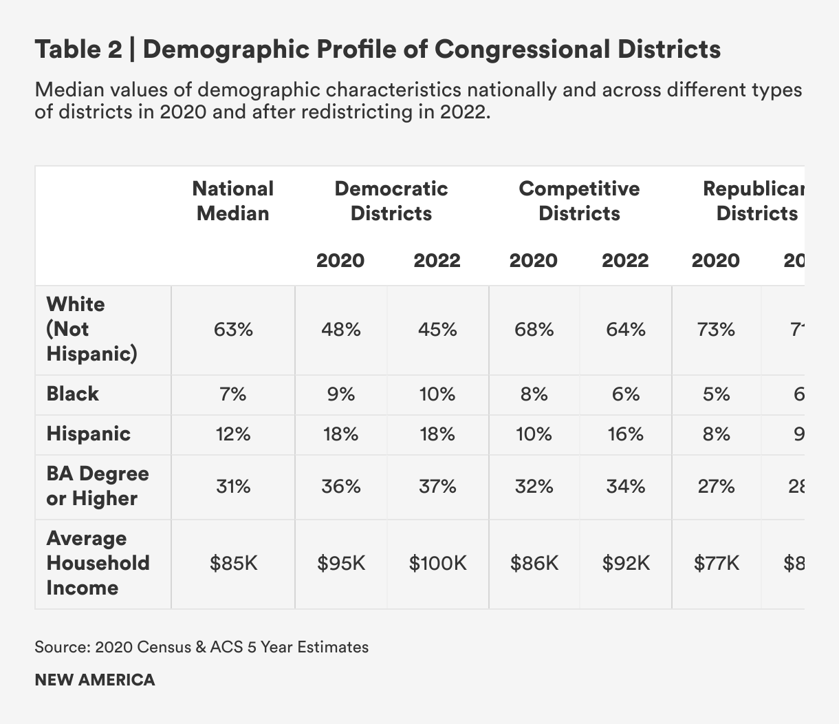 What distinguishes Democratic, Republican, and competitive districts from each other? In this section, we provide a description of demographic characteristics of these districts, for both 2020 and for 2022, after the redistricting process. Polarization and partisan sorting has created a mega-identity composed of reinforcing racial, ethnic, and other social identities. Because of this, the basic demographic breakdown of congressional districts can be informative for understanding the different effects these districts have on Democrats and Republicans.