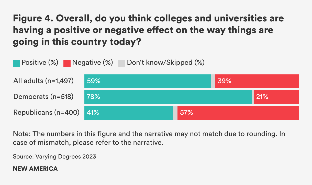 Similar to last year, a majority of Americans (59 percent in 2023 compared to 55 percent in 2022) also think colleges and universities are having a positive impact on the way things are going in the country today. Yet this is still 10 percentage points lower than before the pandemic, when 69 percent of people, in early 2020, said higher education had a positive impact (see Figure 4). This is one question where we saw a significant partisan divide: nearly 80 percent of Democrats said colleges and universities have a positive impact, compared to only 41 percent of Republicans.