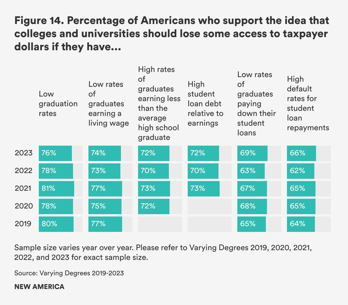 Varying Degrees is conducted with the hope to build a longitudinal data set of public opinion data about education after high school. However, we have made some changes throughout the last seven years to improve the survey instrument and modality of data collection, which may affect the ability to analyze the data long term. One of the major changes was the change in the survey mode from mostly phone to mostly online in 2019. Following the transition to mostly online, we decided to drop the neutral response options (for example: neither agree nor disagree) to improve response quality. Therefore, these changes may explain some of the data shifts from 2017 and 2018 collection years compared to 2019, 2020, 2021, and 2022 collection years.