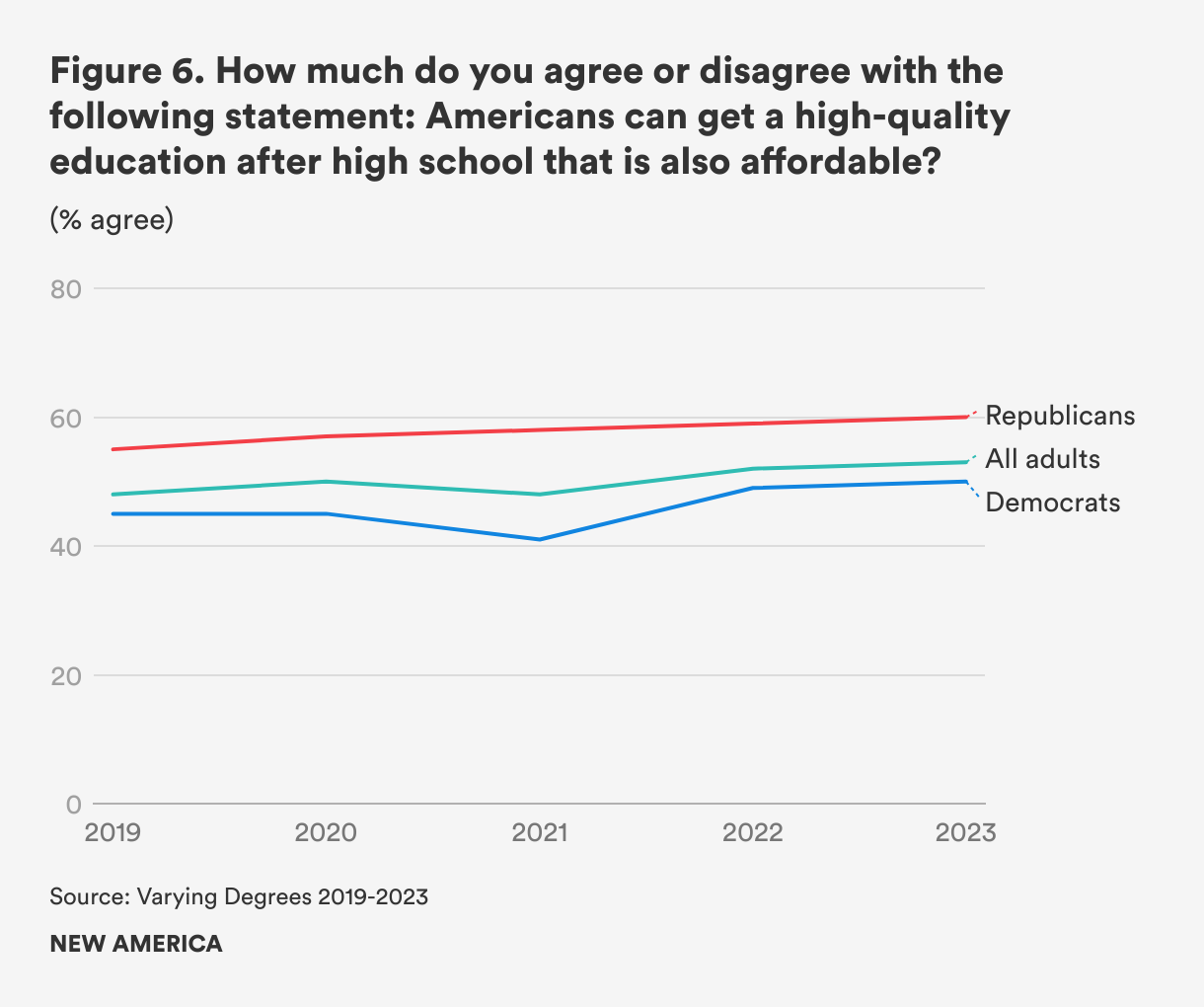 Like in years previous, Americans are divided on whether someone can get a high-quality education after high school that is also affordable: about half (53 percent) agree with this sentiment. While Democrats are equally split on this question, a majority of Republicans (60 percent) think obtaining a high-quality and affordable higher education is possible (see Figure 6).