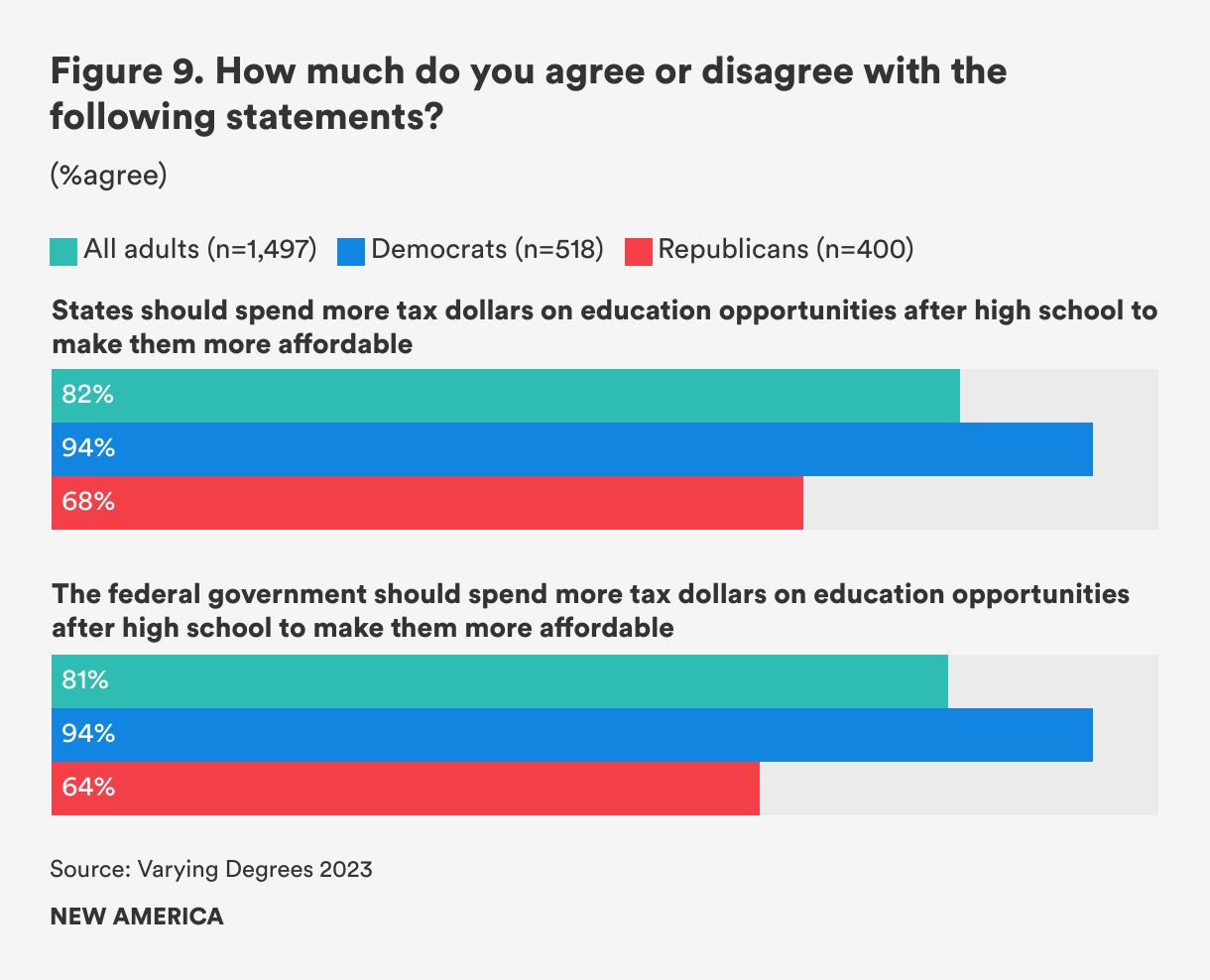 More than eight in ten Americans believe that the federal government and states should spend more taxpayer dollars on educational opportunities after high school in order to make them more affordable. And despite disagreement over whether the government or students should fund higher education, Democrats and Republicans both support more federal and state government spending on higher education. More than 90 percent of Democrats think that both the federal and state government should spend more. Republicans agree, albeit at lower rates: 64 percent for the federal government, 68 percent for state government (see Figure 9).
