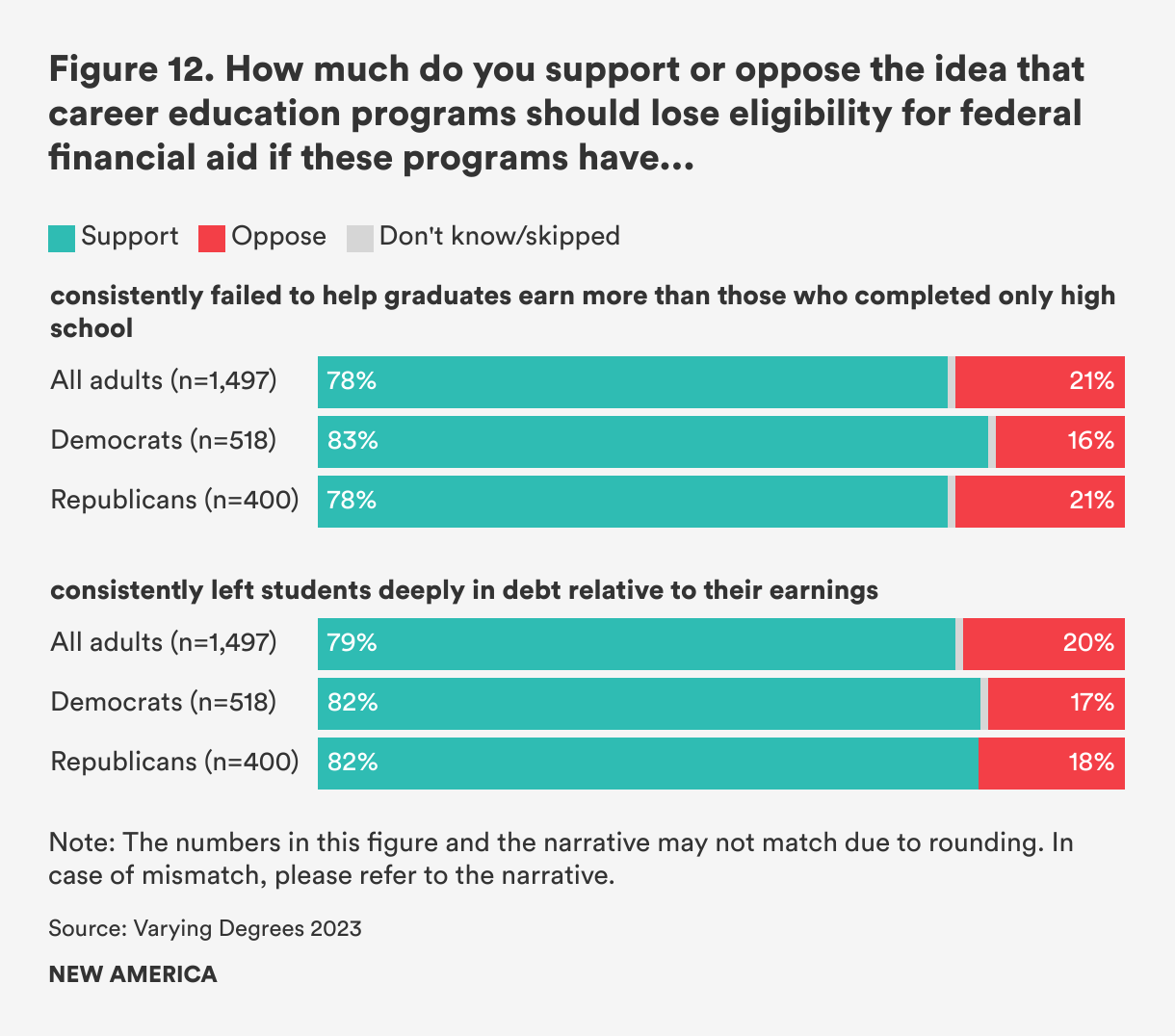 Americans broadly support GE provisions; 79 percent support the idea that programs should lose eligibility for federal financial aid if they consistently leave students deeply in debt relative to their earnings, and 78 percent support the loss of eligibility if programs consistently fail to help graduates earn more than those who complete only a high school diploma (see Figure 12). Democrats and Republicans support both at similarly high rates.