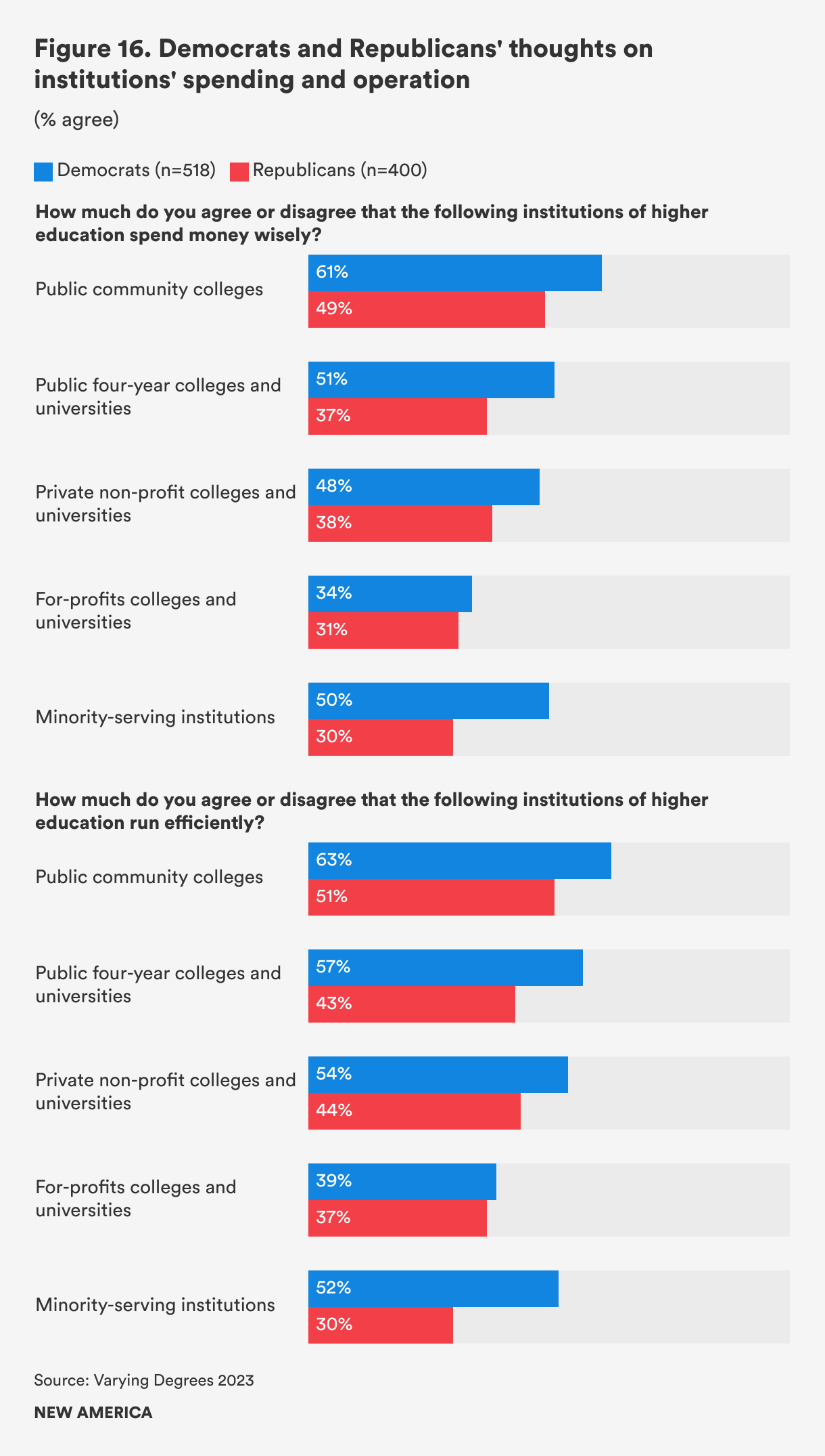 Republicans agree at lower rates than Democrats that colleges operate efficiently and spend their money wisely, even for community colleges. Over the five years that we’ve collected data on these questions, we have noticed a small difference emerge between opinions along party lines. In 2019, for example, 59 percent of Republicans and 66 percent of Democrats believed that community colleges spend their money wisely. Now, only 49 percent of Republicans believe so, compared to 61 percent of Democrats. Similarly, in 2019, 57 percent of Republicans and 66 percent of Democrats agreed that community colleges run efficiently. Now, just half of Republicans (51 percent) agree, compared to 63 percent of Democrats (see Figure 16).