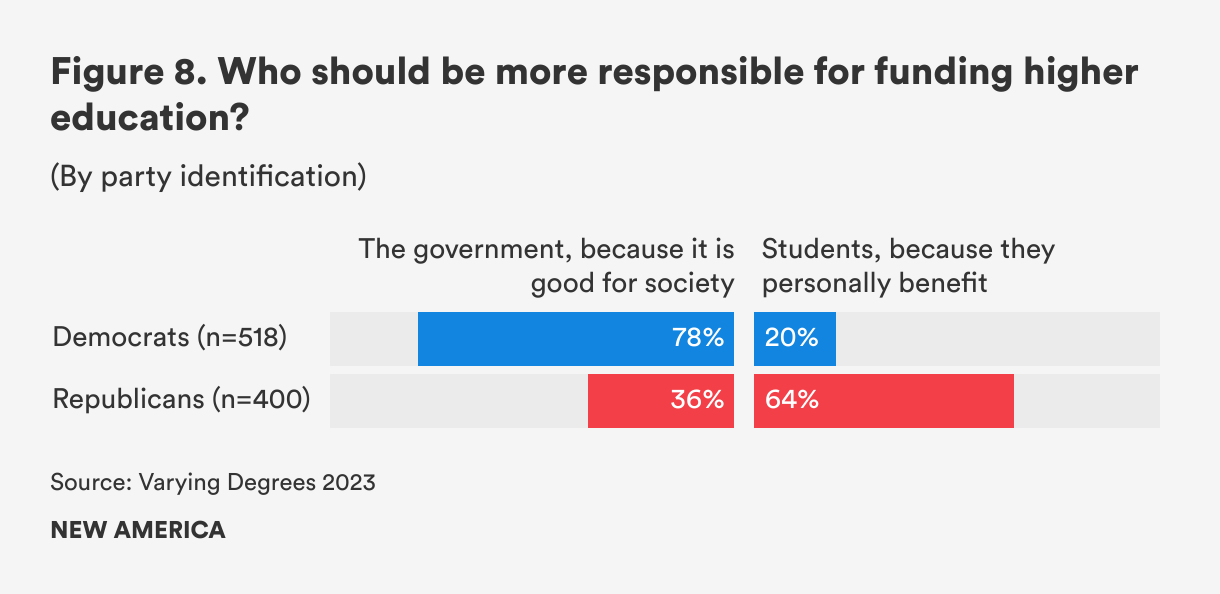 Nearly 8 in 10 (78 percent) Democrats think that the government should fund higher education because it provides benefits to society. On the other hand, nearly two-thirds (64 percent) of Republicans believe students should fund education beyond high school because they personally benefit (see Figure 8). Over the years, Democrats and Republicans have not gotten any closer on this question.