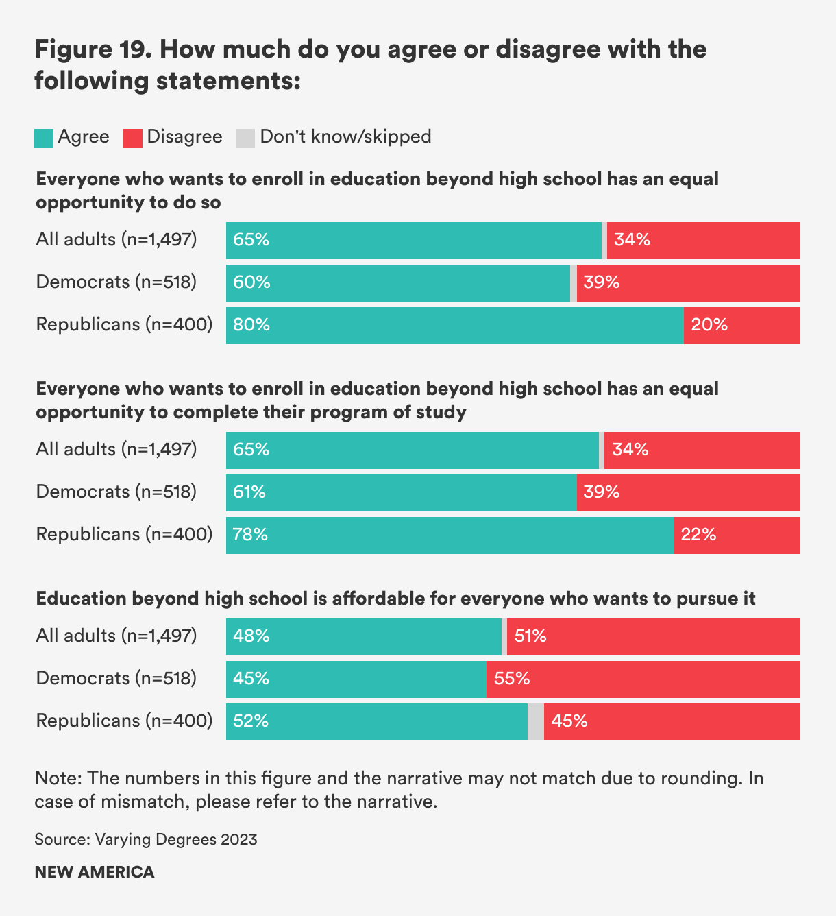 On issues of equal opportunity, we continue to see partisan divergence. Approximately eight in ten Republicans (79 percent) think that everyone who wants to enroll in postsecondary educational opportunities has an equal opportunity to do so, compared to 60 percent of Democrats. Similarly, 78 percent of Republicans and 61 percent of Democrats believe that everyone has an equal opportunity to complete their program of study. Both groups, however, are less likely to agree that higher education is affordable for anyone who wishes to pursue it (53 percent of Republicans and 45 percent of Democrats) (see Figure 19).