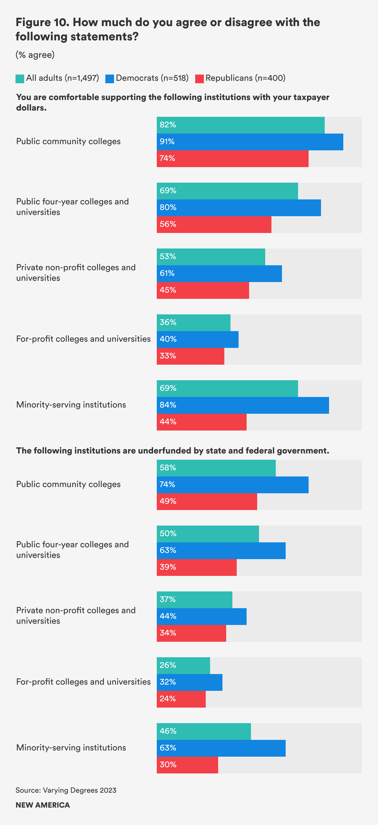 Both groups are wary of for-profit colleges and universities receiving taxpayer support. Just 40 percent of Democrats and 33 percent of Republicans expressed support for their taxpayer dollars going toward these institutions. As has been the case in previous years, Democrats and Republicans remain deeply divided over whether they support their taxpayer dollars going to MSIs: 84 percent of Democrats do, compared to just 44 percent of Republicans.