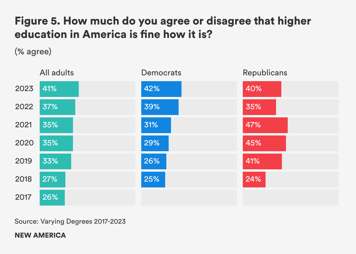 Two in five Americans (41 percent) think higher education is fine how it is. Even though this number is still in the minority, 41 percent is actually the highest number we have seen since we began the survey in 2017, when only 26 percent thought higher education was fine the way it is (see Figure 5). Americans across political parties agree with this statement at similar rates.