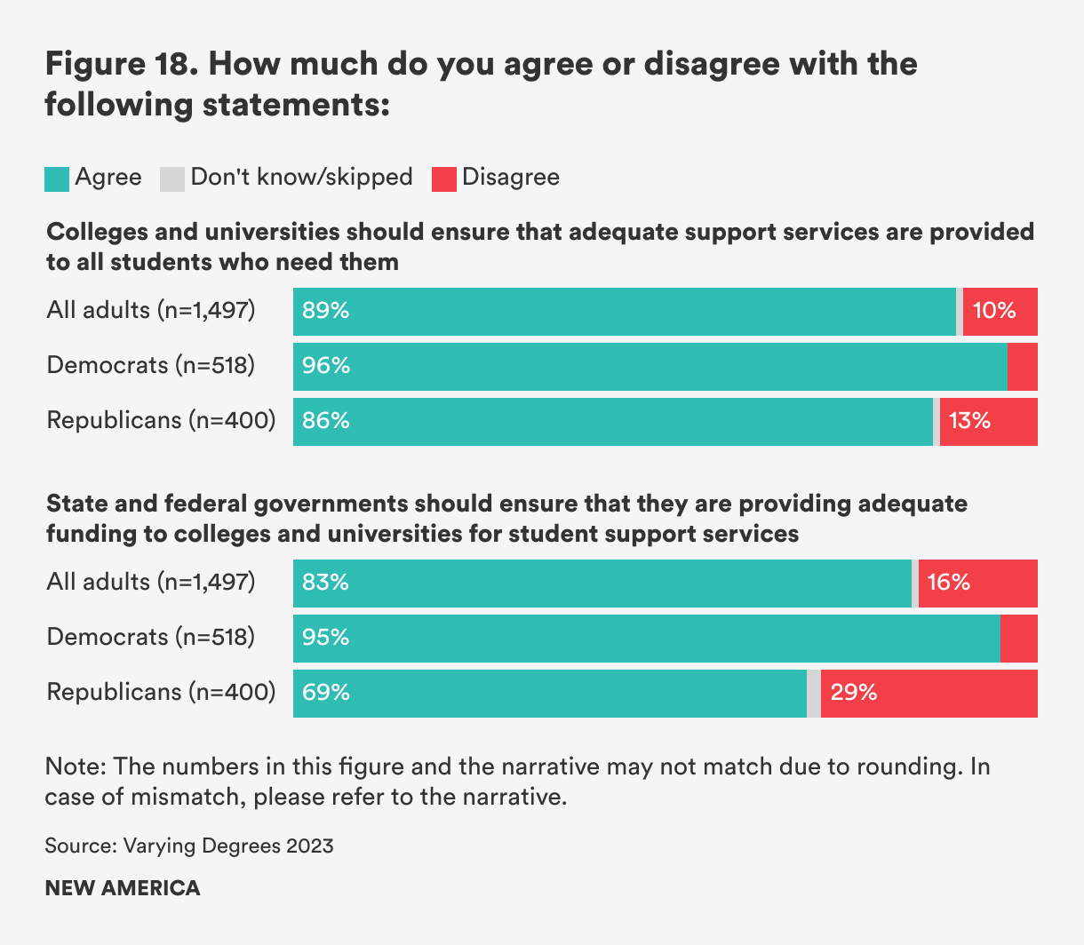 Nine in ten Americans agree that colleges and universities should provide adequate support services to students who need them. This finding holds across party lines, with 96 percent of Democrats and 85 percent of Republicans agreeing that institutions should offer adequate support. There is more of a partisan divide when it comes to whether federal and state government should provide colleges and universities with adequate funding for student support services: 95 percent of Democrats agree, compared with 69 percent of Republicans (see Figure 18).
