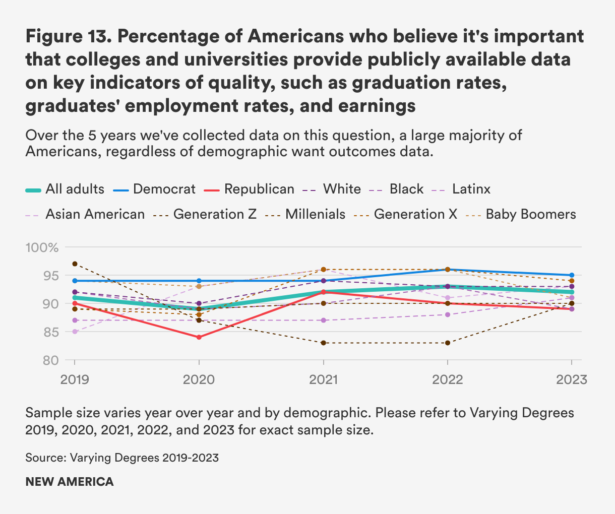 Americans support transparency on key indicators of quality, and they should welcome the push by the Department to increase transparency about student outcomes. Since 2019, about 90 percent of Americans say they believe it is important that colleges and universities provide publicly available data about graduation rates, employment rates, and earnings (see Figure 13). This high rate of agreement holds across party lines, generation,19 and race and ethnicity. In the history of the Varying Degrees survey, no question comes this close to universal agreement year over year.