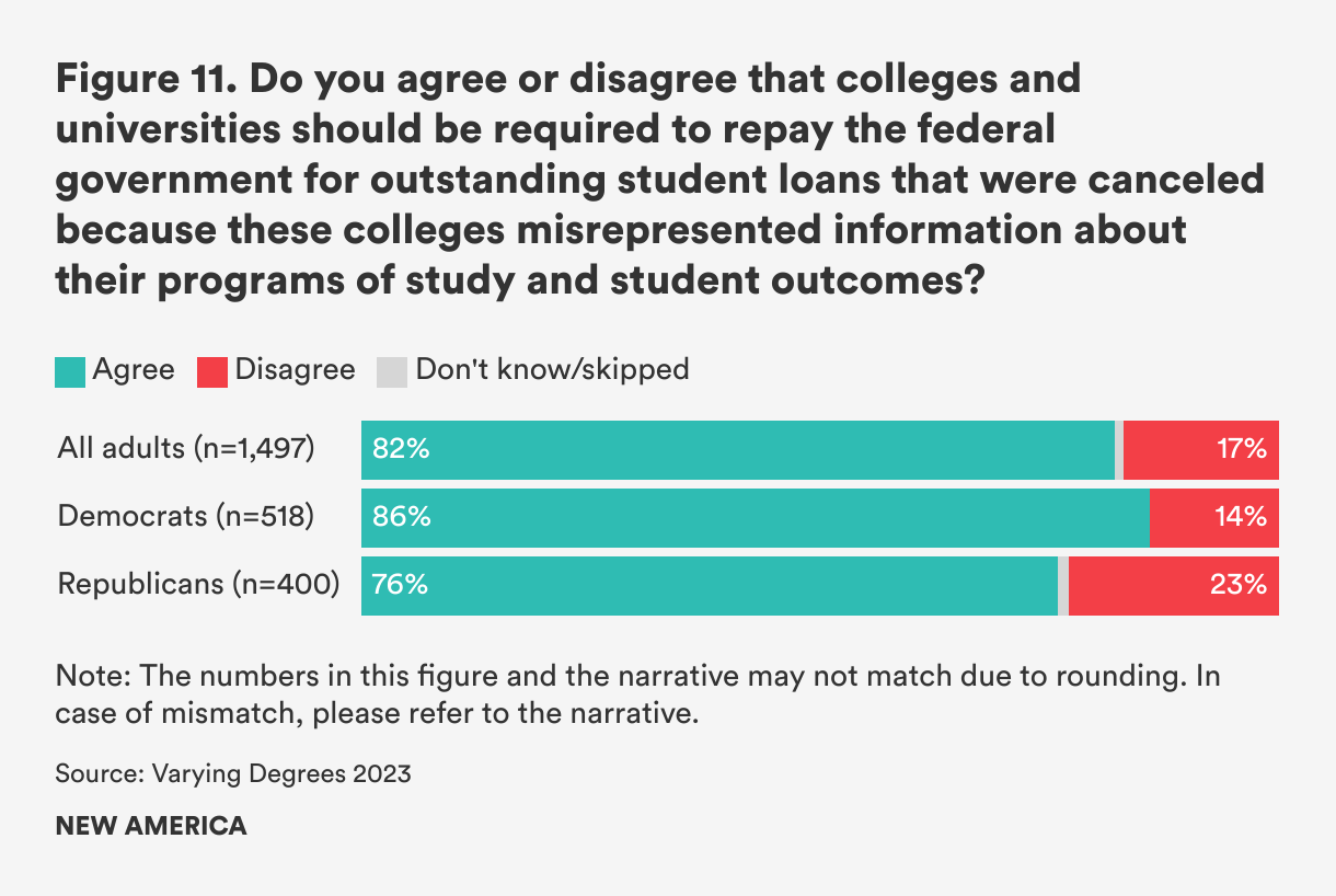 This year we asked whether Americans agree that colleges and universities should be required to repay the federal government for outstanding student loans that were discharged through BD claims. More than four in five Americans (82 percent) agreed with recouping money from institutions for BD discharges (see Figure 11).