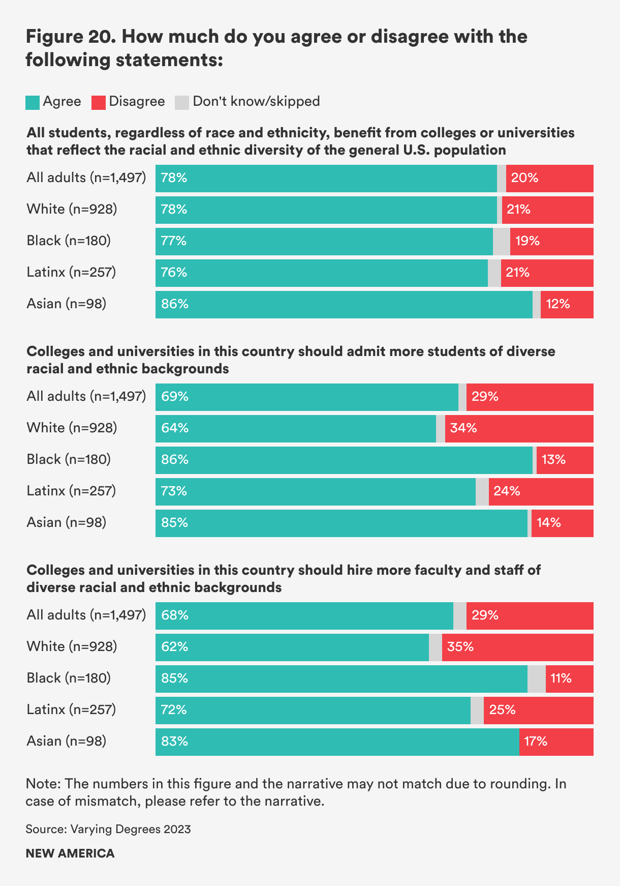 Asian Americans agree that all students benefit from college campuses that reflect the racial diversity of the U.S. (86 percent). Black (86 percent) and Asian (84 percent) Americans agree at the highest rates in our survey that colleges and universities should admit students from diverse racial and ethnic backgrounds, and that they should hire racially diverse faculty as well (85 percent for Black respondents and 83 percent for Asian respondents) (see Figure 20).