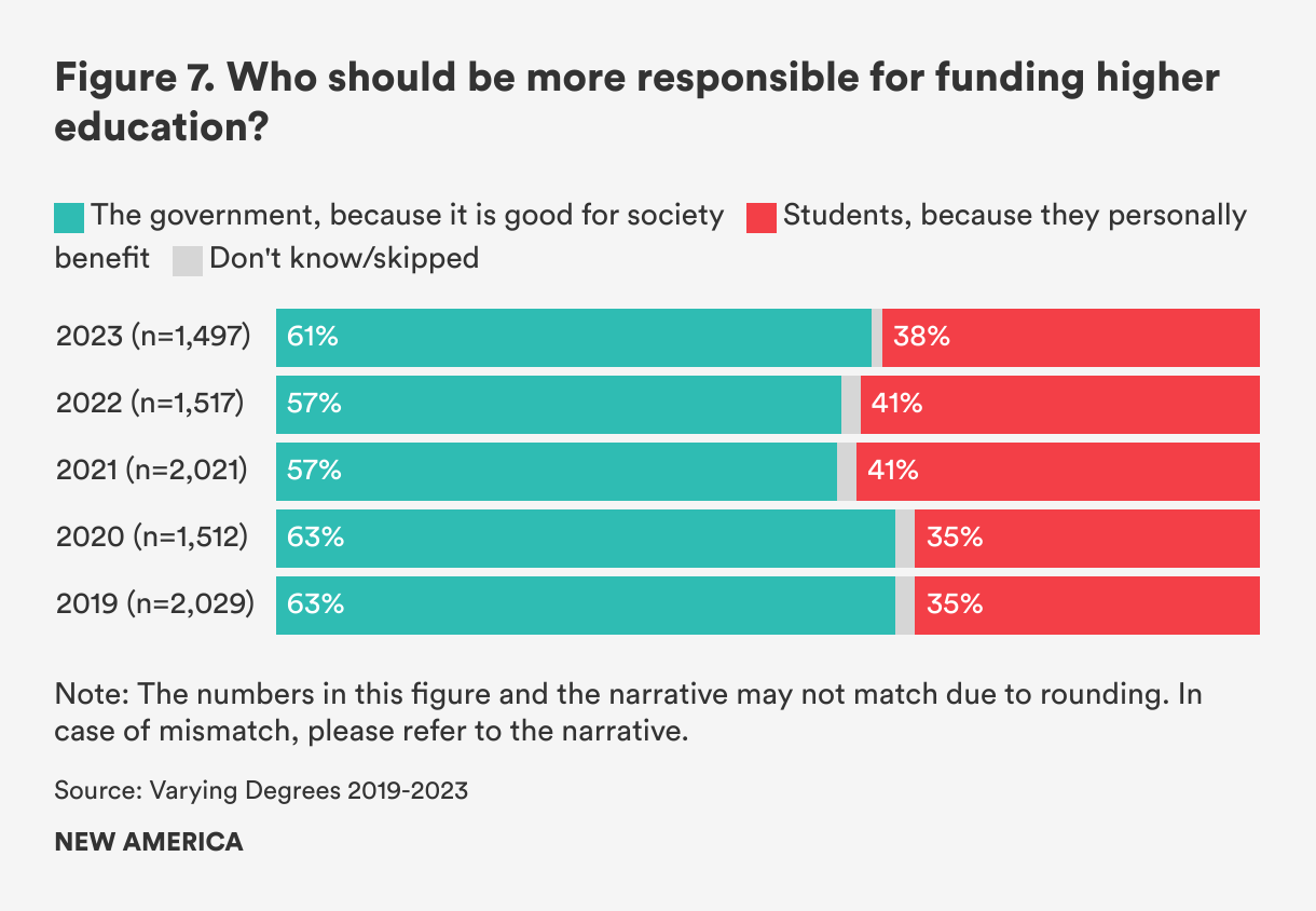 For the past six years, we have asked Americans who should fund higher education: the government, because it is good for society; or individuals, because they personally benefit. We find that the majority of Americans (60 percent) believe that the government should be funding education after high school, which has been consistent since 2018 (see Figure 7).