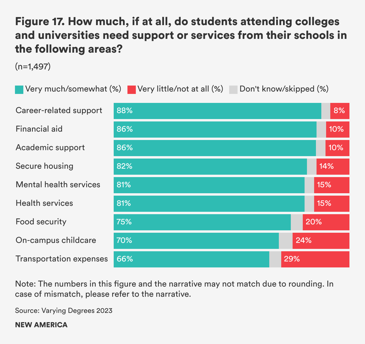 Americans acknowledge that students attending colleges and universities need a variety of academic and basic need supports and resources from their schools. A majority believe that students need career-related support (88 percent), financial aid (87 percent), and academic support (85 percent). They also strongly believe that colleges and universities must provide more, and favor the provision of housing (82 percent) and food (76 percent) support and on-campus child care (70 percent) (see Figure 17).