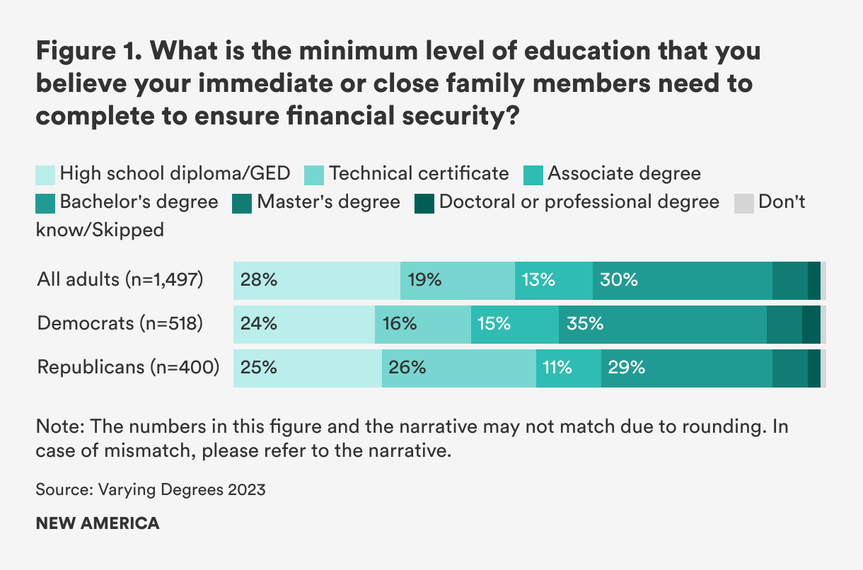 Americans still believe in the value of education beyond high school. At least four in five Americans say that it is easier to find a well-paying, stable career if individuals receive any type of education beyond high school, be it a technical certificate, an associate degree, or a bachelor’s degree. Seven in ten Americans believe that the minimum level of education their close family members need to complete to ensure financial stability is at least a technical certificate: nearly 40 percent think the minimum level should be at least a bachelor’s degree. This belief holds across party lines and racial background (see Figure 1).