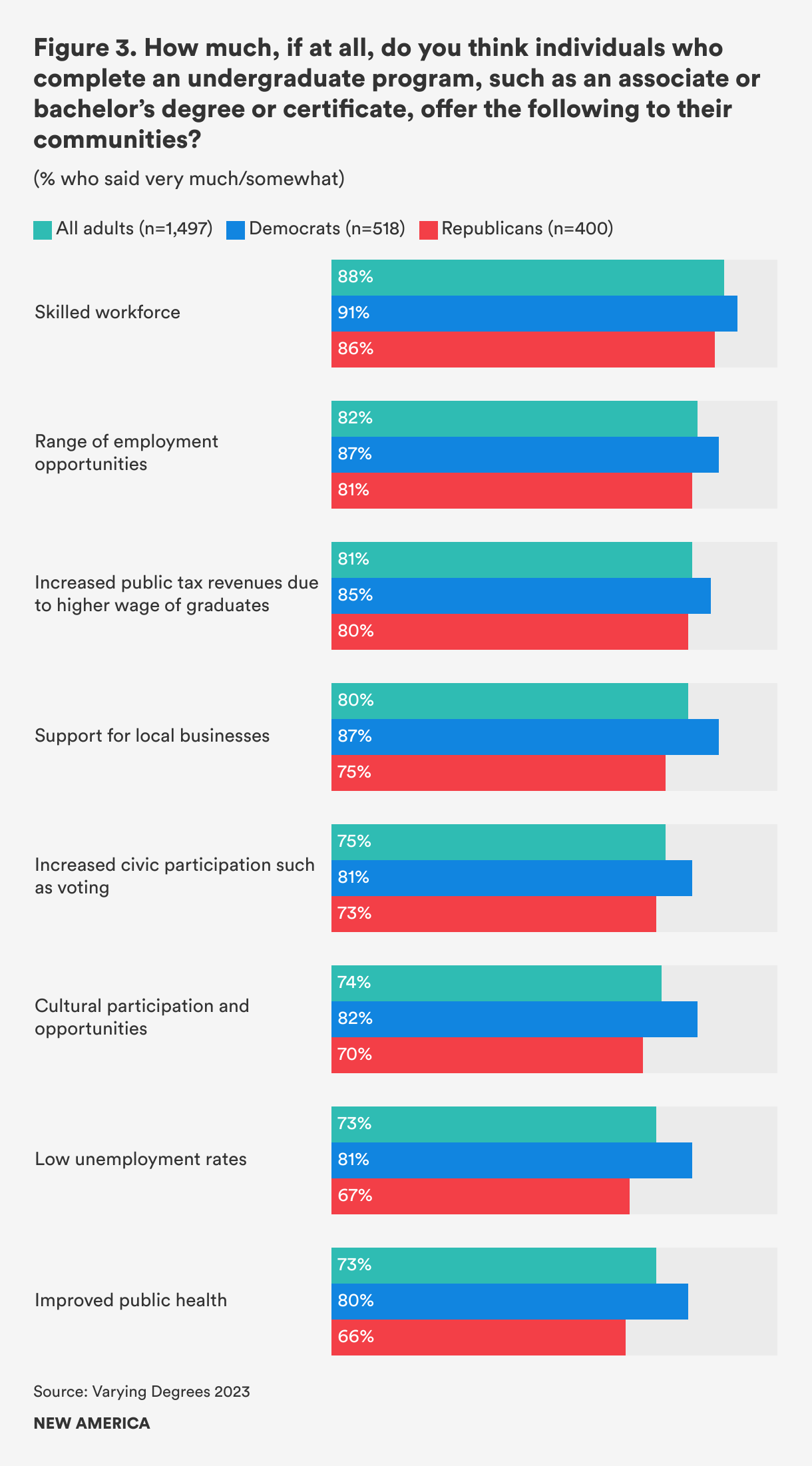 Americans are more aligned on the benefits that individuals with postsecondary degrees can contribute to society. Nearly 90 percent of them believe that individuals with undergraduate credentials contribute to a skilled workforce. Four in five believe that these individuals also increase public tax revenues and support for local businesses. More than 70 percent think that individuals with undergraduate credentials increase civic engagement, contribute to lower unemployment rates, and improve public health (see Figure 3).