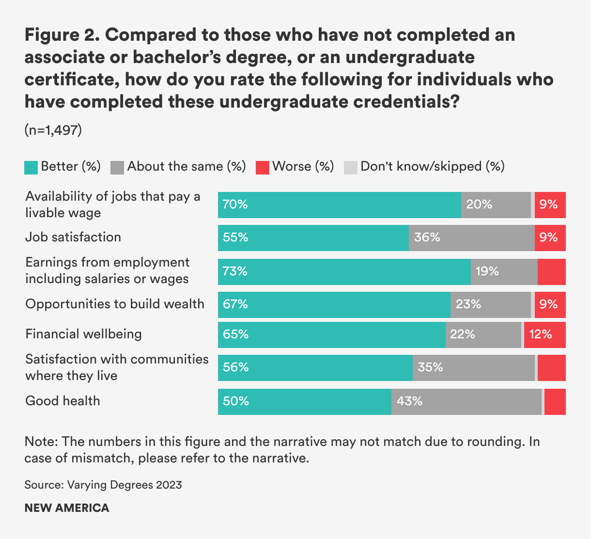 Americans have mixed opinions about what individuals with postsecondary credentials benefit from higher education: more would agree on the financial benefits of higher education than non-financial ones. Nearly three in four Americans believe that those with undergraduate credentials (i.e., certificate, associate, or bachelor’s degree) have greater earnings from their employment and better access to jobs that pay a living wage, and two in three believe that these individuals also have better financial well-being and opportunities to build wealth than those with only a high school degree. At the same time, only 55 and 56 percent respectively believe that those with undergraduate credentials enjoy greater job satisfaction and satisfaction with the communities they live in. Half think that these individuals also have better health (see Figure 2).