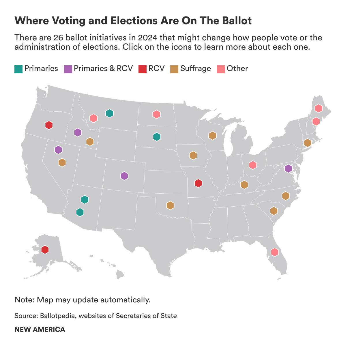 The following map shows that in most of these places voters will be asked to decide on changes to how primaries are run, whether to adopt ranked-choice voting (or prohibit it entirely in one case), and whether to make it easier or harder to vote. In the rest of the states, voters will decide on issues including the allocation of Electoral College votes, campaign finance limits, redistricting commissions, and school board election procedures. In North Dakota, voters approved in June a ballot initiative that intends to set age limits for congressional candidates.