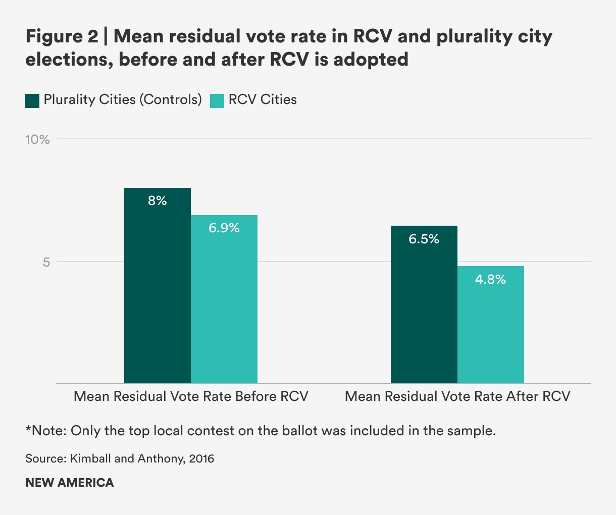 Many studies have addressed the “is RCV too confusing?” question by comparing the rate of residual, or invalid votes, recorded in plurality and RCV elections. In most cases, the residual vote rate—the difference between the total ballots cast and the number of valid votes recorded for the contest in question—has been found to be about the same, or lower, after adopting RCV, or in RCV cities versus plurality cities. Residual votes (or uncounted or voided votes) include undervotes (votes left blank), overvotes, and other mismarkings that cause the ballot to be disqualified.