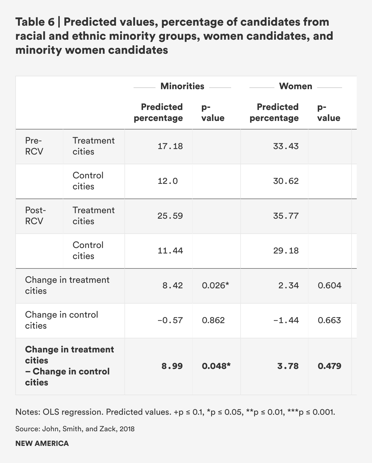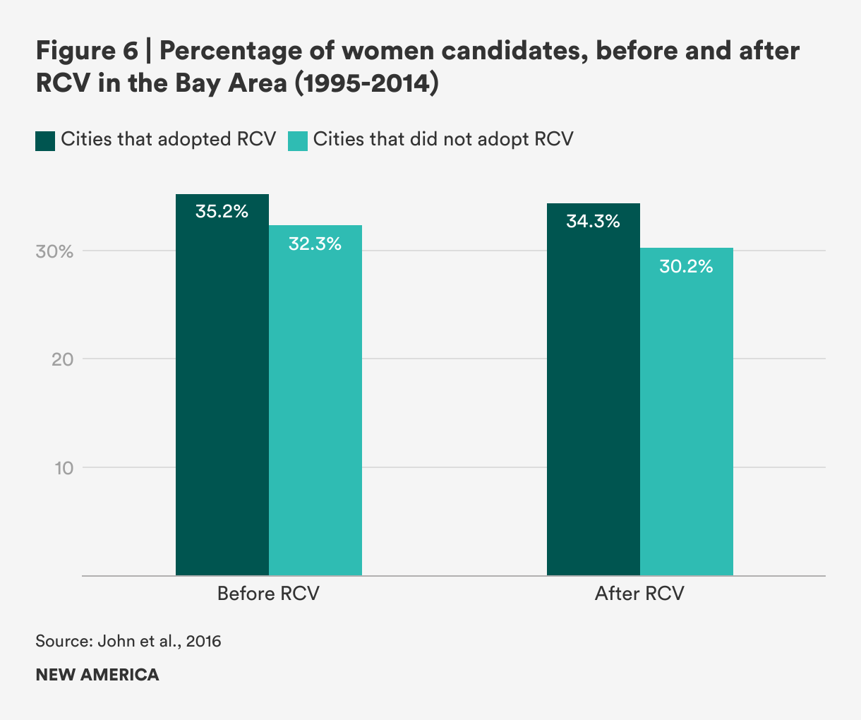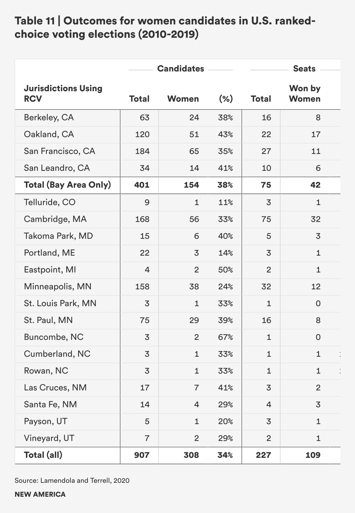 - Sarah John, Haley Smith, Elizabeth Zack, Cynthia Terrell, Michelle Whittaker, Jennifer Pae, and Rob Richie, The impact of ranked choice voting on representation: How ranked choice voting affects women and people of color candidates in California (Takoma Park, MD: RepresentWomen, 2016), <a href="<a href="<a href="<a href="source">source">source">source">source">source; Cynthia Richie Terrell, Courtney Lamendola, and Maura Reilly, “Election Reform and Women’s Representation: Ranked Choice Voting in the U.S.,” Politics and Governance 9, (June 2021): 332–343, <a href="<a href="<a href="<a href="source">source">source">source">source">source.