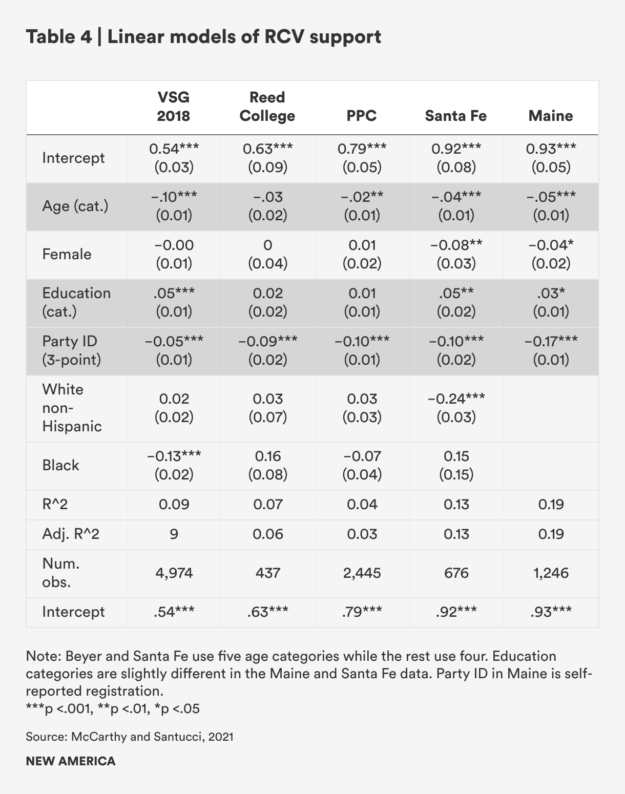 Joseph Coll found similar age-related differences in self-reported understanding in a survey of likely 2020 Democratic presidential primary voters. More older voters said they experienced increased difficulty, but then were actually more likely to complete their ballots correctly, utilizing all of their rankings. This is consistent with scholarship showing older voters have the strongest status quo bias, and relatedly, the greatest resistance to voting rule changes (as discussed in a later section). However, it hints that self-reported understanding measures have their limits. Like Donovan et al., Coll’s findings challenge the argument that certain racial, ethnic, or socioeconomic groups are more likely to have difficulty understanding RCV than others.19