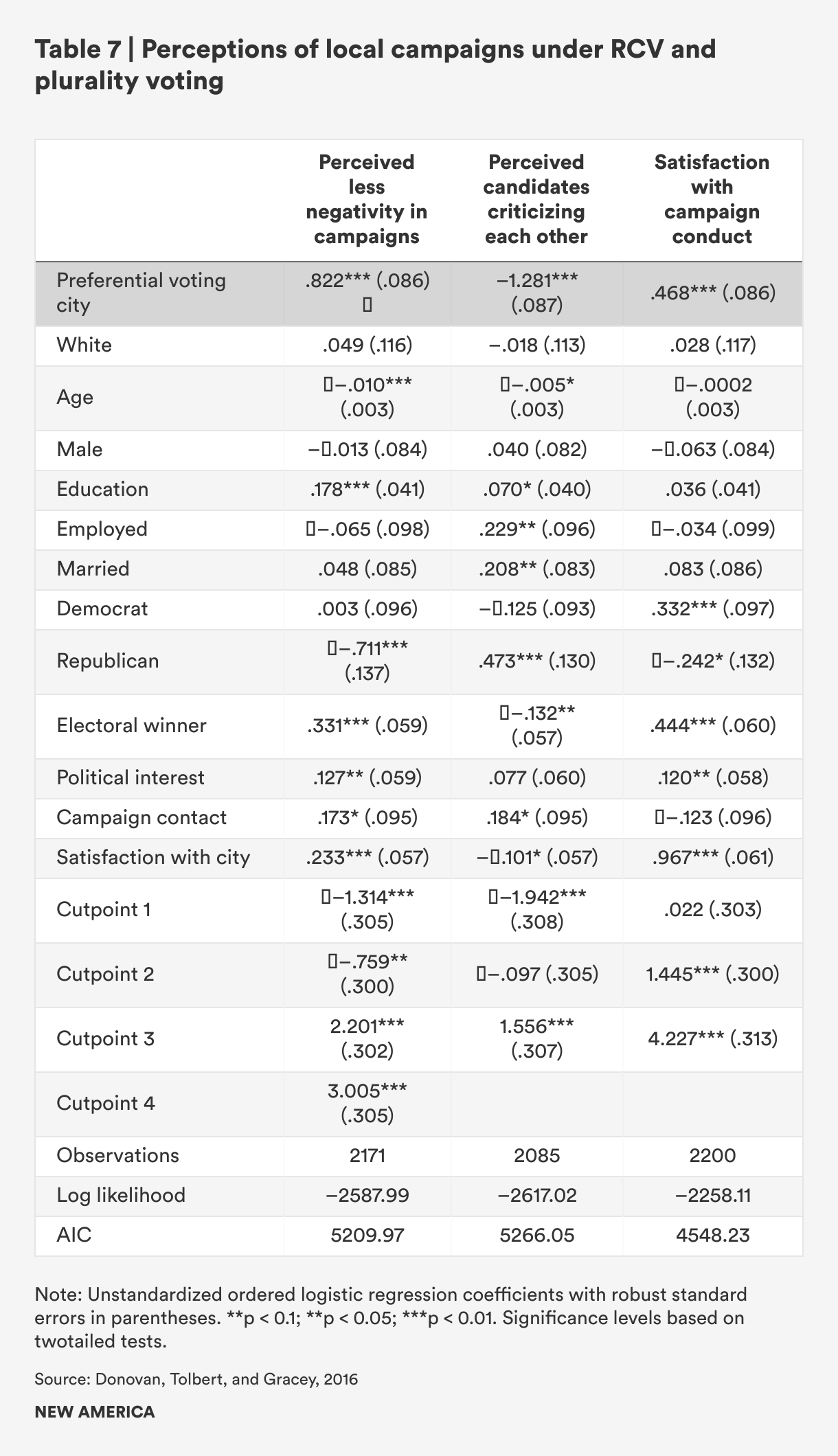 - Denise Munro Robb, The Effect of Instant Runoff Voting on Democracy (unpublished doctoral dissertation) (Irvine, CA: University of California, 2011). Eamon McGinn, Rating Rankings: Effect of Instant Run-off Voting on Participation and Civility; Todd Donovan, “Candidate Perceptions of Campaigns under Preferential and Plurality Voting,” (paper prepared for the workshop on Electoral Systems, Electoral Reform, and Implications for Democratic Performance, Stanford University, March 14‐15, 2014), <a href="<a href="<a href="<a href="source">source">source">source">source">source; Todd Donovan, Caroline Tolbert, and Kellen Gracey, “Campaign Civility Under Preferential and Plurality Voting,” Electoral Studies 42 (June 2016): 157‐163, <a href="<a href="<a href="<a href="source">source">source">source">source">source; Martha Kropf, “Using Campaign Communications to Analyze Civility in Ranked Choice Voting Elections,” Politics and Governance 9 (June 2021): 280–292, <a href="<a href="<a href="<a href="source">source">source">source">source">source; McGinn, Rating Rankings: Effect of Instant Run-off Voting on Participation and Civility.