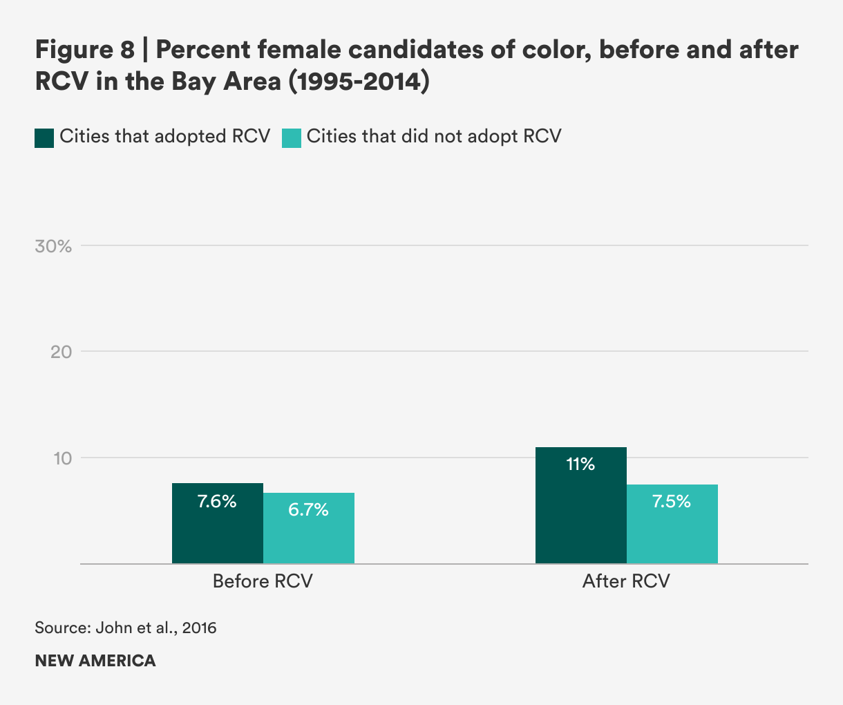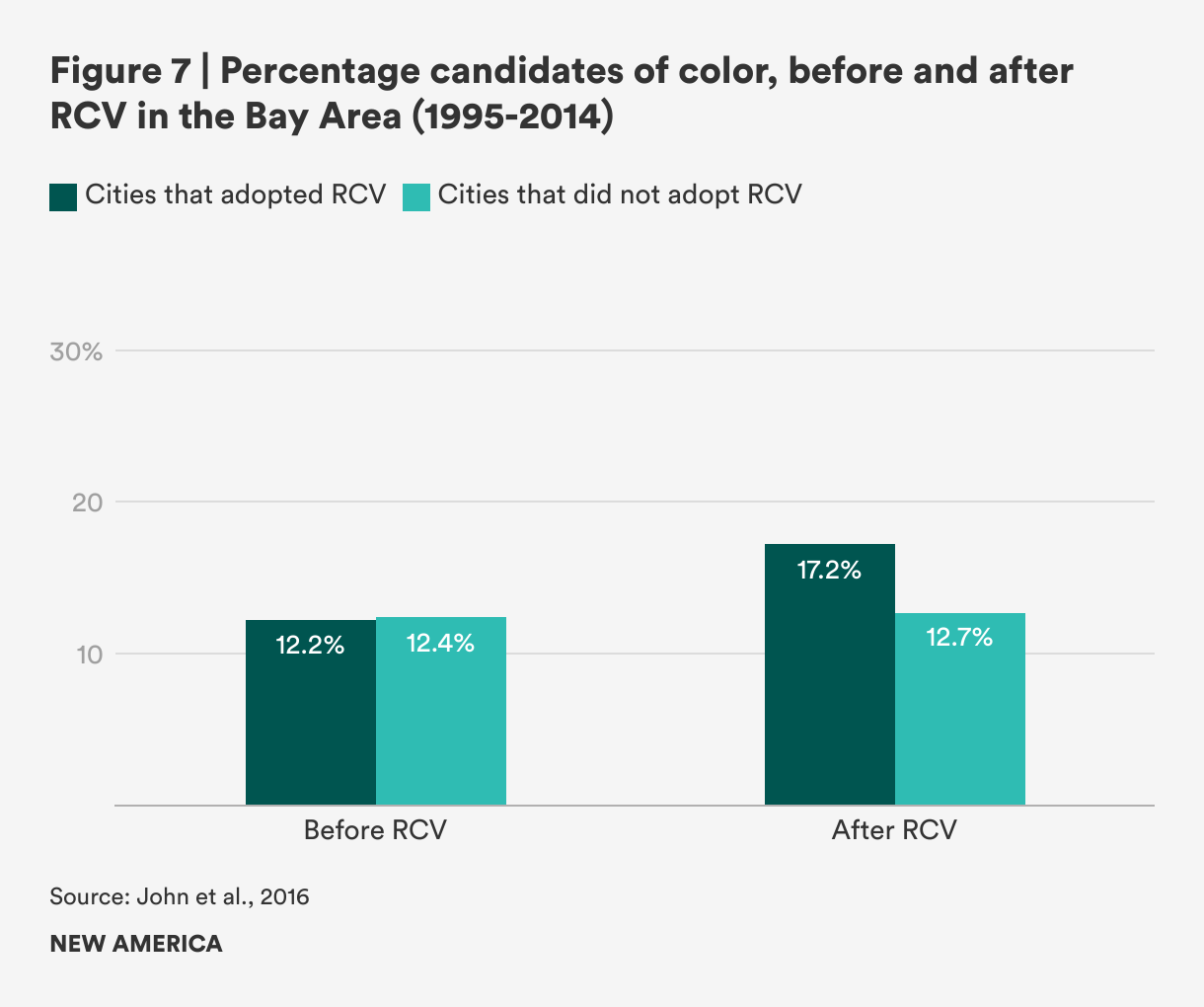 Second, the fact that cities do not choose to adopt RCV randomly challenges researchers’ ability to draw clear conclusions about how much before and after changes were due to the implementation of RCV as opposed to other trends and factors. Several researchers have attempted to work around this by using matched cities or synthetic controls, but given the small sample sizes and the idiosyncrasies of cities like Berkeley, Oakland, San Francisco, and Minneapolis, such techniques still make clear conclusions elusive.