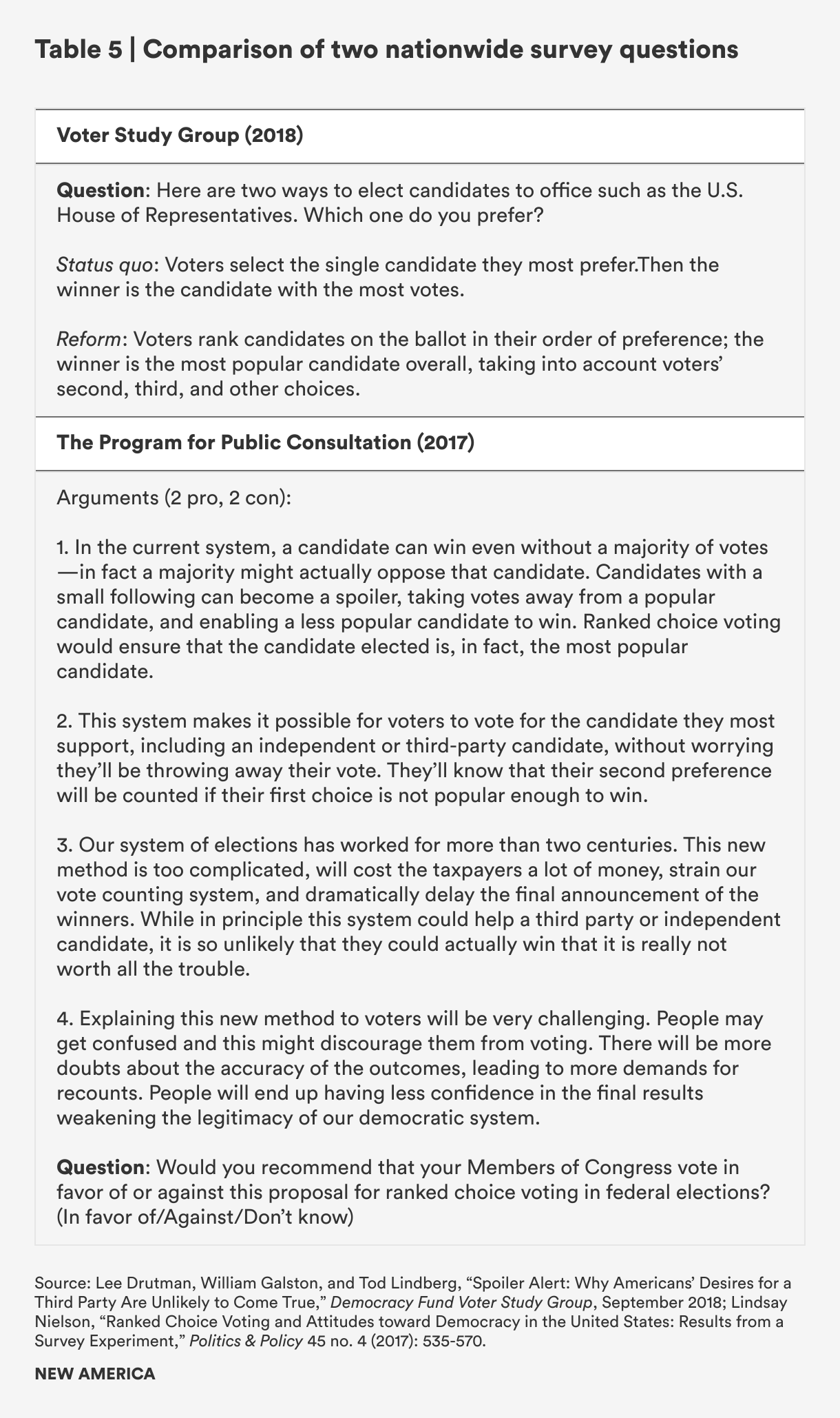 - Lee Drutman, William Galston, and Tod Lindberg, Spoiler Alert: Why Americans’ Desires for a Third Party Are Unlikely to Come True (Washington, DC: Democracy Fund Voter Study Group and New America, 2018), <a href="<a href="<a href="<a href="<a href="source">source">source">source">source">source">source; Nielsen, “Ranked Choice Voting and Attitudes toward Democracy in the United States: Results from a Survey Experiment.”