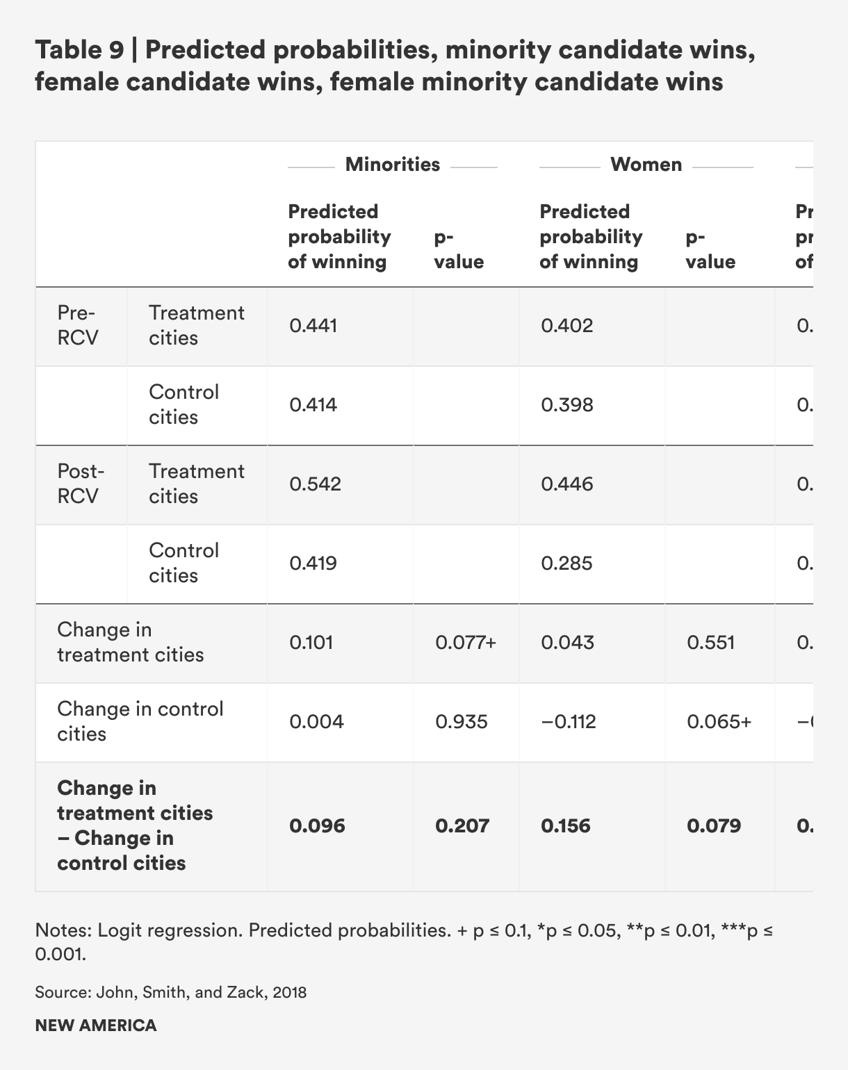 However, many of the other hoped-for benefits, such as more diverse candidates (by gender, race, and ideology), higher turnout, and more viable parties are harder to detect. Nor is there any evidence that RCV changes policy outcomes.