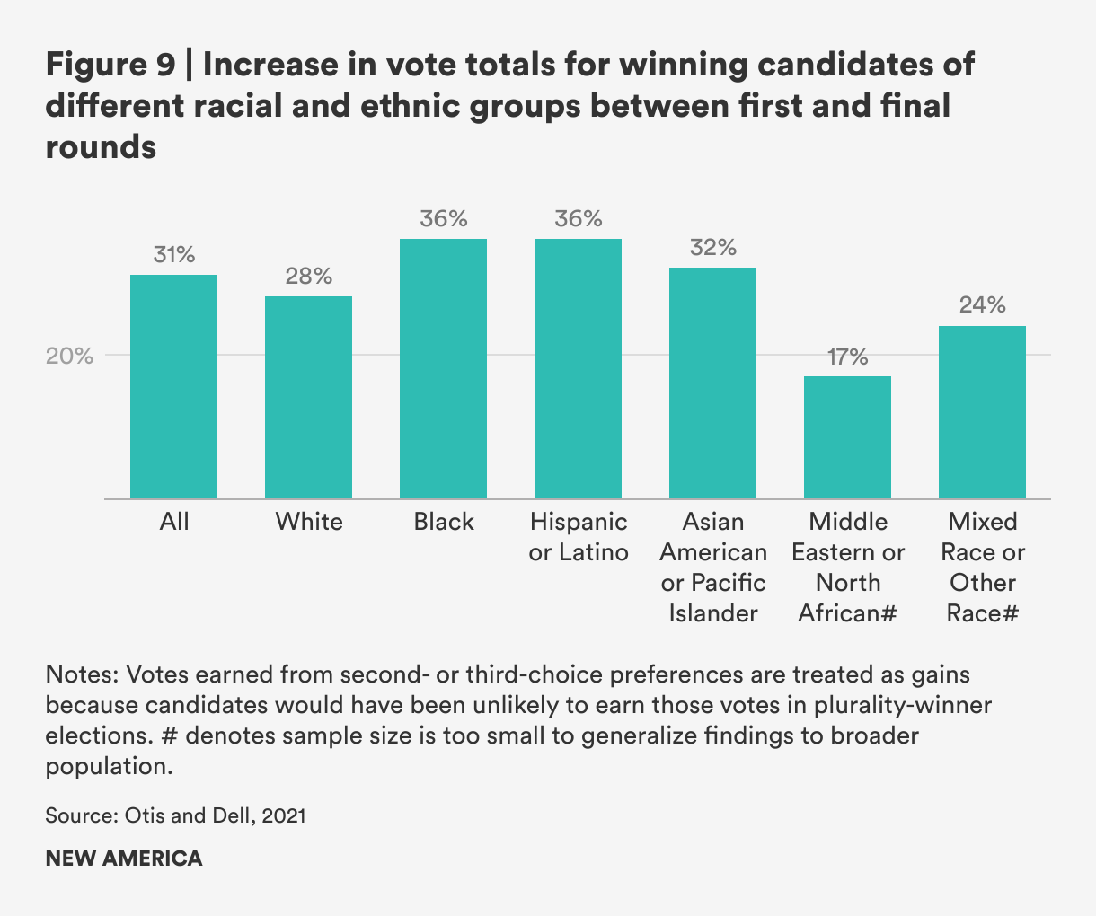 A third measure of interest for any electoral reform is whether it changes the types of candidates who win. In theory, ranked-choice voting should lead not only to more diversity among candidates, but among winners as well. Under RCV, we should expect to see more moderate or consensus-oriented winners. This should reduce polarization as candidates are encouraged to appeal more broadly and build coalitions. RCV should also lead to winners from third parties, independents, and historically underrepresented demographic groups. Currently, we lack sufficient data to confirm these theories as they relate to moderates, independents, and third parties, though the growing usage of RCV in primaries may provide some better evidence. On the other hand, available data supports the claim that RCV leads to more BIPOC and female winners.