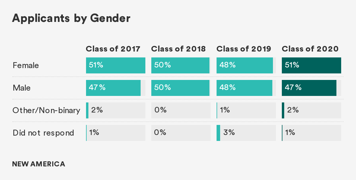 This year, 51 percent of the candidate pool identified as female and 47 percent identified as male. The breakdown (nearly at parity) is in line with the last three year’s candidate pool and is a promising trend to note as it relates to who applies to the program.
