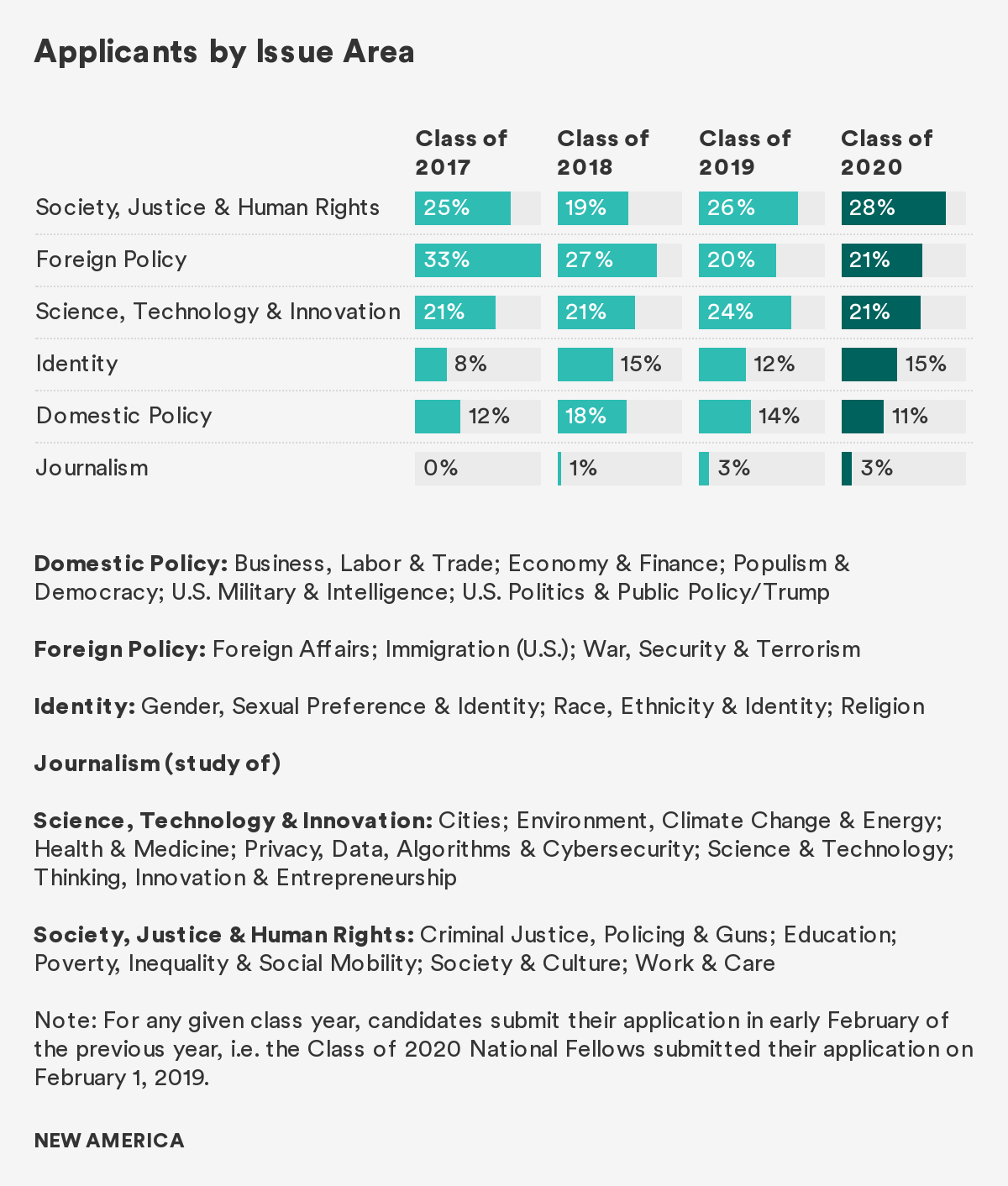 Over the past three years, there has been a downward trend with the number of applications in the “Foreign Policy” issue area; 33 percent for the Class of 2017 to 21 percent for the Class of 2020. Applications focused on societal issues (“Society, Justice & Human Rights” and “Identity”) made up nearly half of this year’s applicant pool; a steady increase over the past three years from 33 percent for the Class of 2017 to 43 percent for the Class of 2020.