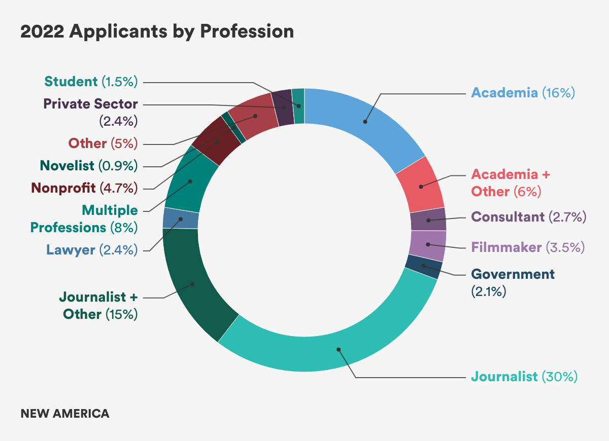 While the Fellows Program attracts applicants from a range of professions, the majority of our applicants are journalists (45 percent) followed by those working in academia (22 percent). The applicants by profession are as follows.