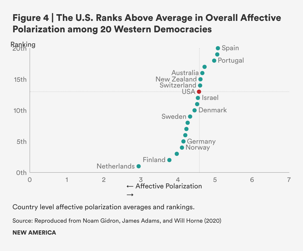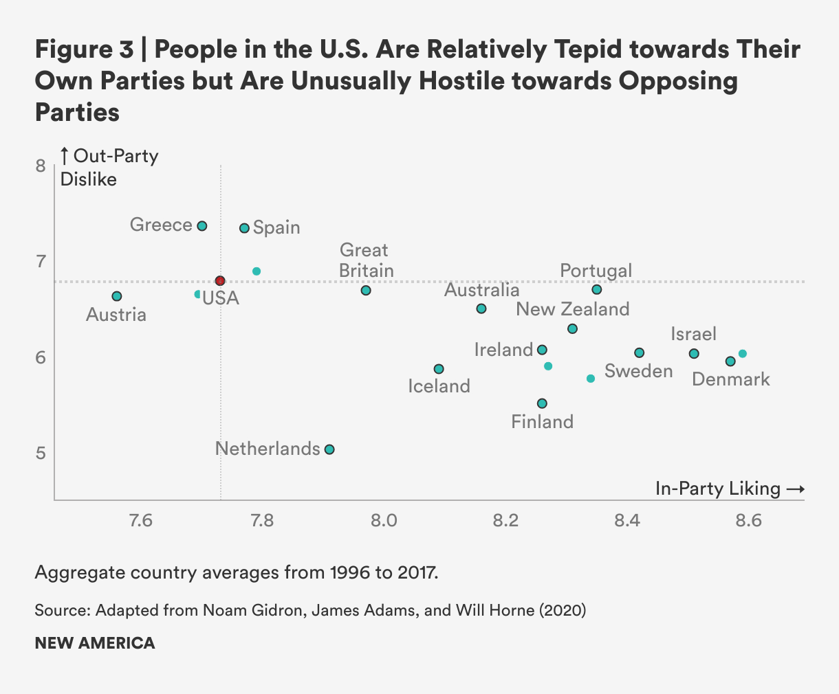 Analysis of the Comparative Study of Electoral Systems (CSES) across multiple elections in 20 Western democracies reveals that Americans between 1996 and 2017 were relatively tepid towards their own parties, unusually hostile towards their opponents, and above average in terms of overall affective polarization, as shown in Figures 3 and 4.53 This data also shows that out-party dislike has risen in the U.S. to a greater extent than in other countries observed.