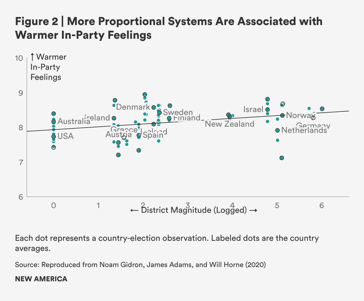 An analysis of 20 Western democracies offers further reason to investigate our elections, finding no significant relationship between electoral system and affective polarization, but rather a strong link between election method and what affective polarization represents.47 Affective polarization—as the following section further elaborates—is usually constructed as the difference between in-group and out-group ratings. As shown in the chart reproduced below, proportional representation increases in-party identification and decreases out-party derogation while winner-take-all decreases in-party identification and increases out-party derogation. While the overall affective polarization score may not significantly differ between systems, in proportional representation systems this number represents a far “gentler and kinder” method of politics than in first-past-the-post.48 These findings correspond strongly to the idea that proportional representation, by being less oppositional than winner-take-all, creates a less rivalrous, angry, and hostile politics.
