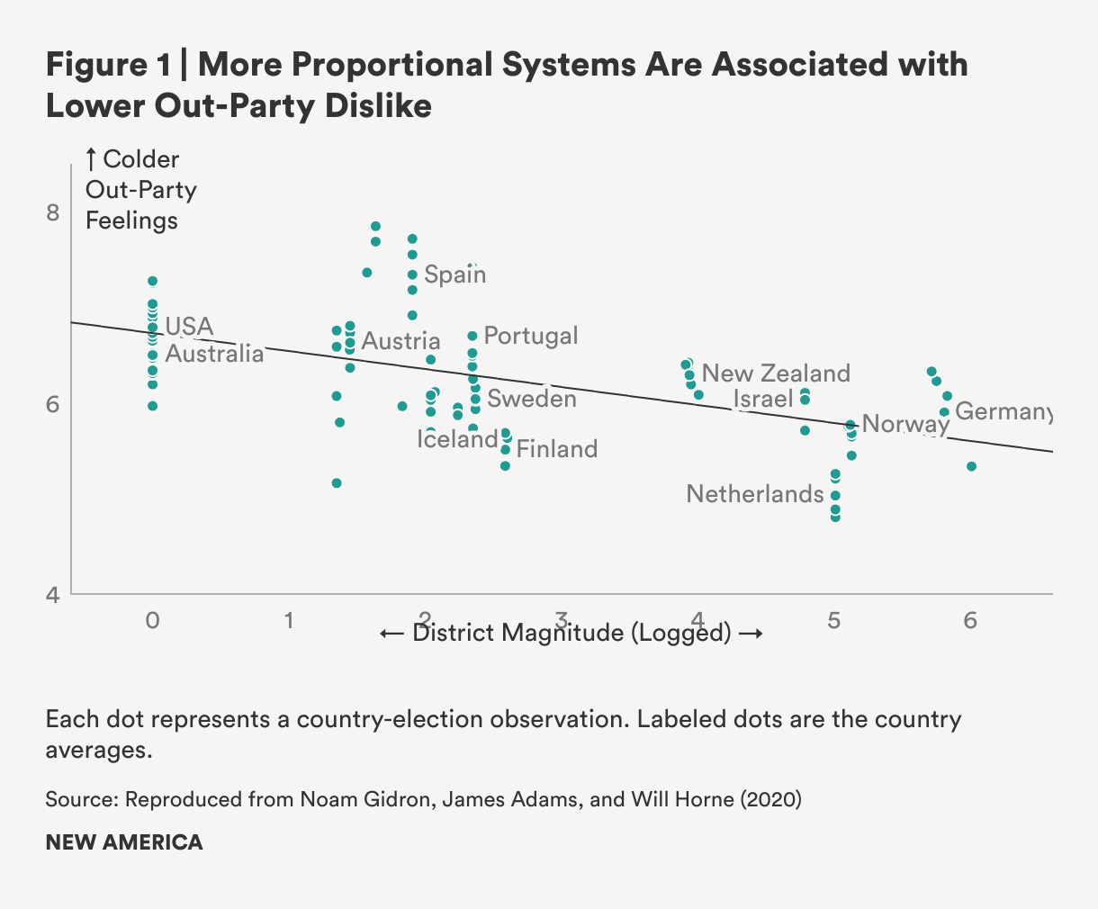 This lack of specificity is particularly an issue in measures of affective polarization. The most used measurement, the difference in in-versus-out-party affection, inherently represents a great deal of information. As such it is hard to differentiate the effects of differing numbers of parties on affective polarization, as this measure will represent something far different in a two-party system as opposed to a multiparty environment where one's feelings towards other parties might vary wildly. Additionally, research should answer what causes these differences. In a multiparty system out-party hostility may be lower on average because many of the opposition parties might be ideologically like one's own. However, it may also be due to a partisan feeling less threatened by other parties even if they dislike them because the chance of any one of them winning sole power is very low. Disentangling these effects is key to understanding the real effects of reform.