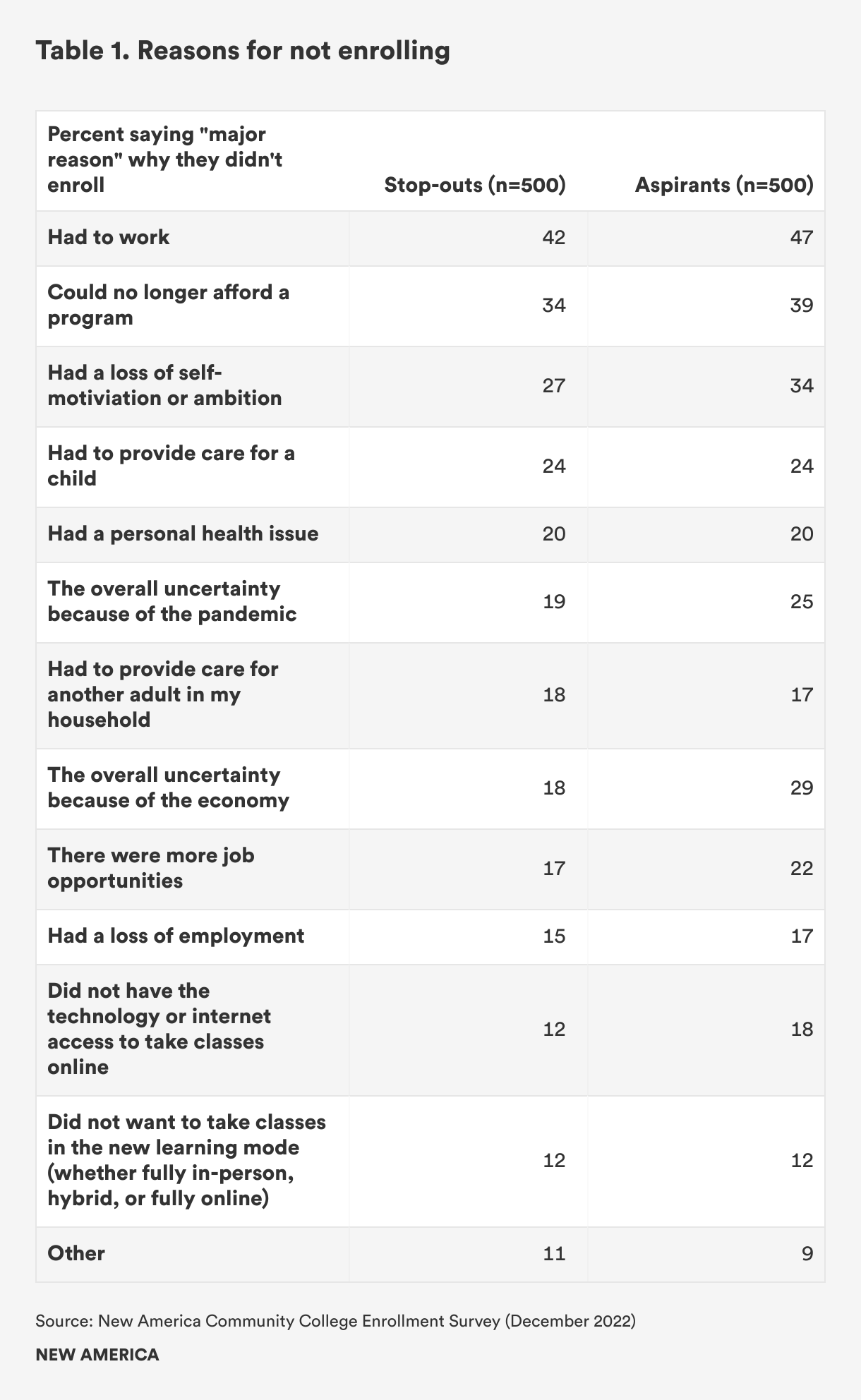Having to work remains a top reason why stop-outs (42 percent) and aspirants (47 percent) decided not to enroll, and the shift for aspirants has been more pronounced. While uncertainty due to the pandemic was the top reason for both groups to not enroll in 2020, it now is having to work.