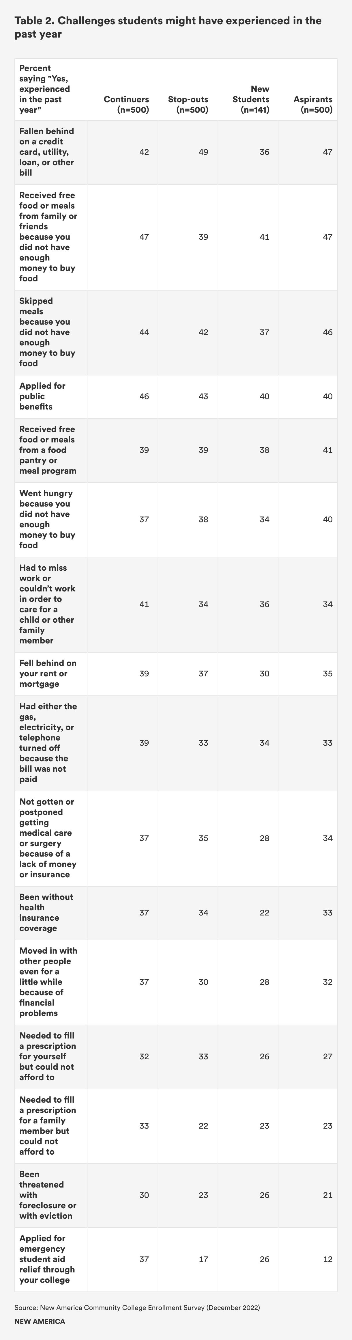 Across all groups, significant percentages are experiencing economic hardship. At the high end, nearly half (49 percent) of stop-outs report falling behind on a bill, with aspirants (47 percent) and continuers (42 percent) trailing behind. Many respondents also received free food from a friend or family member (between 39 and 47 percent) and skipped meals (between 37 and 46 percent) because they did not have enough money to buy food, thus indicating that food insecurity also poses a great risk to these students (see Table 2). These rates of food insecurity are worse than they were when this survey was first conducted: in 2020, the rate of respondents receiving free food from a friend or family member ranged between 36 and 41 percent, and the rate of respondents skipping meals ranged between 32 and 37 percent.